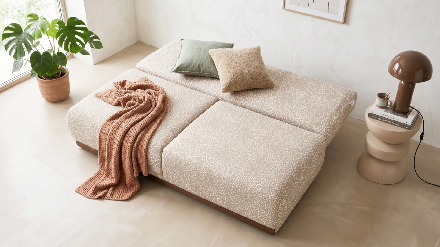 Canapé convertible Auteuil — velours côtelé beige Le canapé convertible Auteuil séduit par sa silhouette épurée et ses matières nobles. Sans accoudoirs, il affiche un design contemporain et généreux, souligné par un piètement en bois massif coloris Noyer. Convertible en un instant Le mécanisme automatique déploie le couchage en quelques secondes, sans...