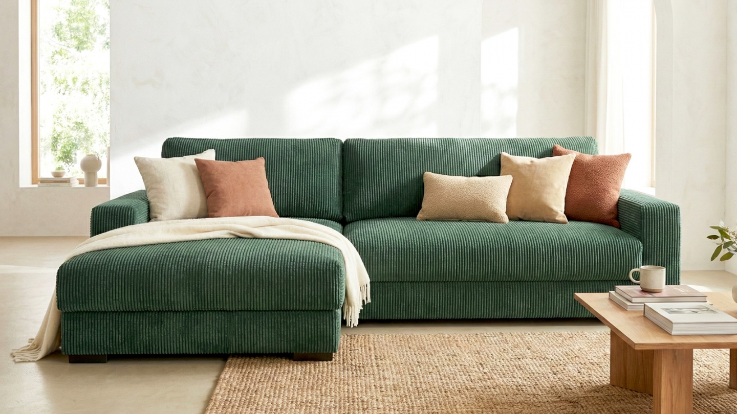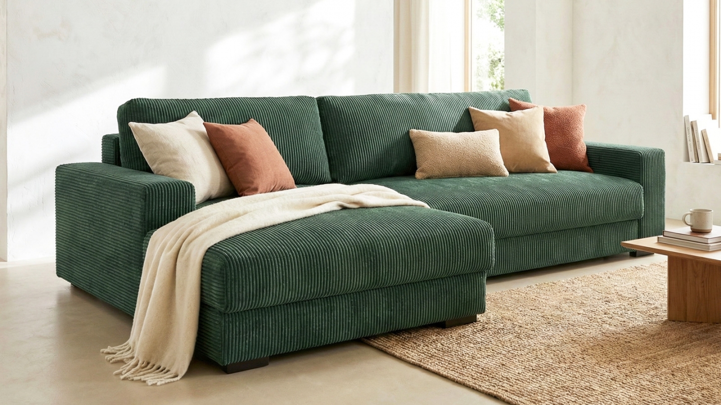 Optez pour un confort inégalé avec ce superbe canapé d'angle gauche convertible 3/4 places en velours côtelé vert foncé de la collection Arty.