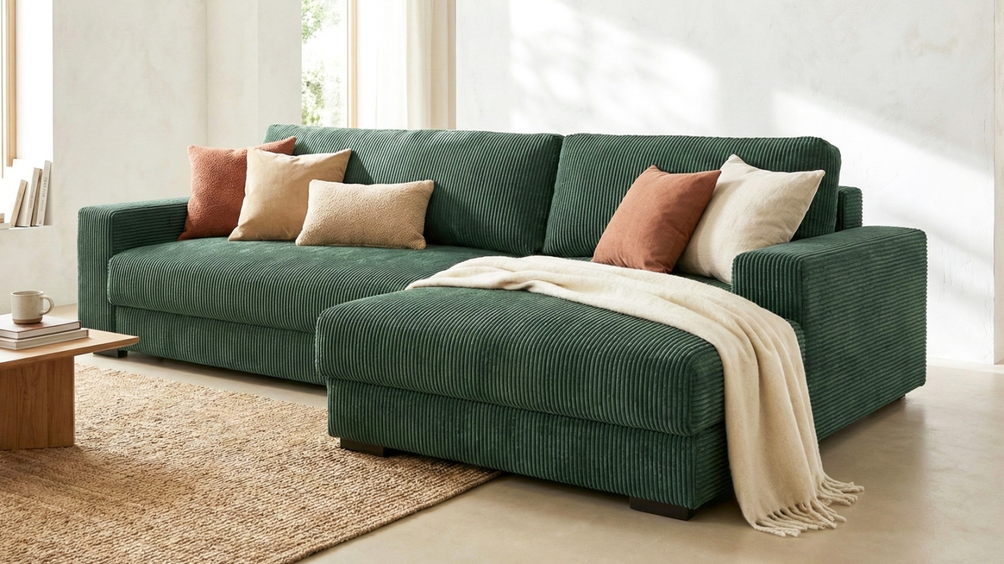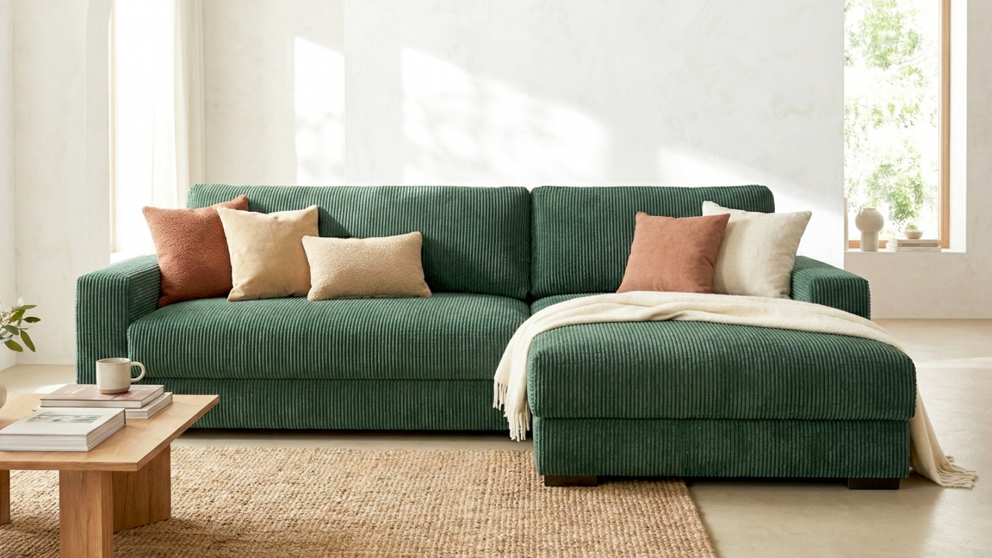 Canapé d'angle convertible 3/4 places en velours côtelé vert foncé