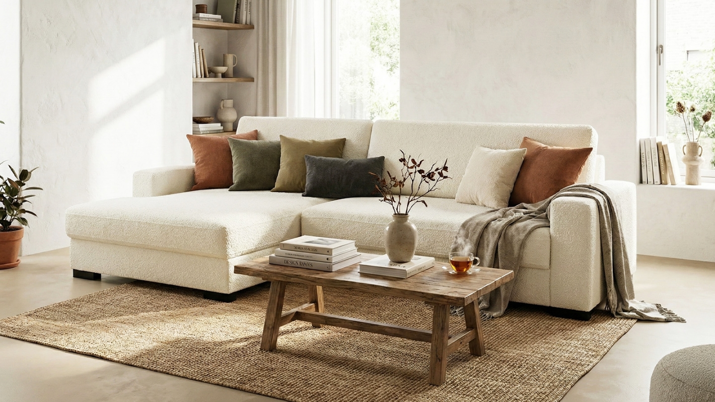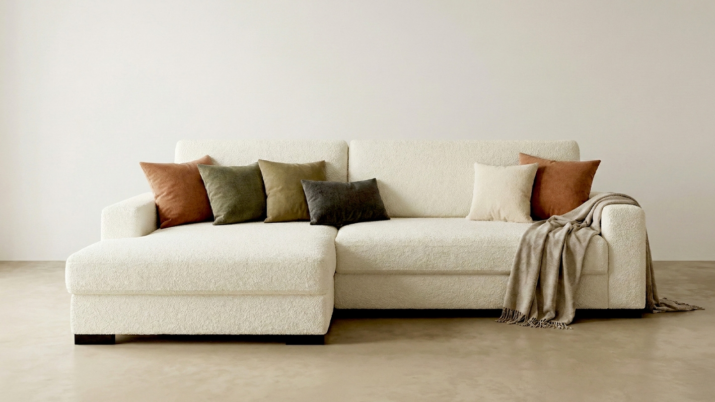 Ce canapé d'angle gauche convertible 3/4 places en tissu bouclé écru deviendra la pièce maîtresse de votre salon !