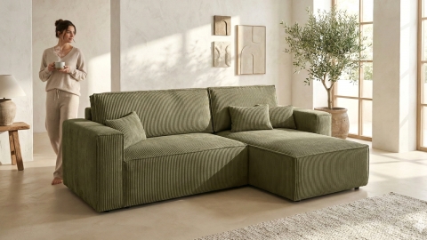 Ce canapé d'angle convertible 4 places en velours côtelé kaki Livia est idéal pour ceux qui aiment se prélasser ! Son revêtement en velours côtelé et son coloris kaki s'accorderont parfaitement avec la décoration de votre salon !