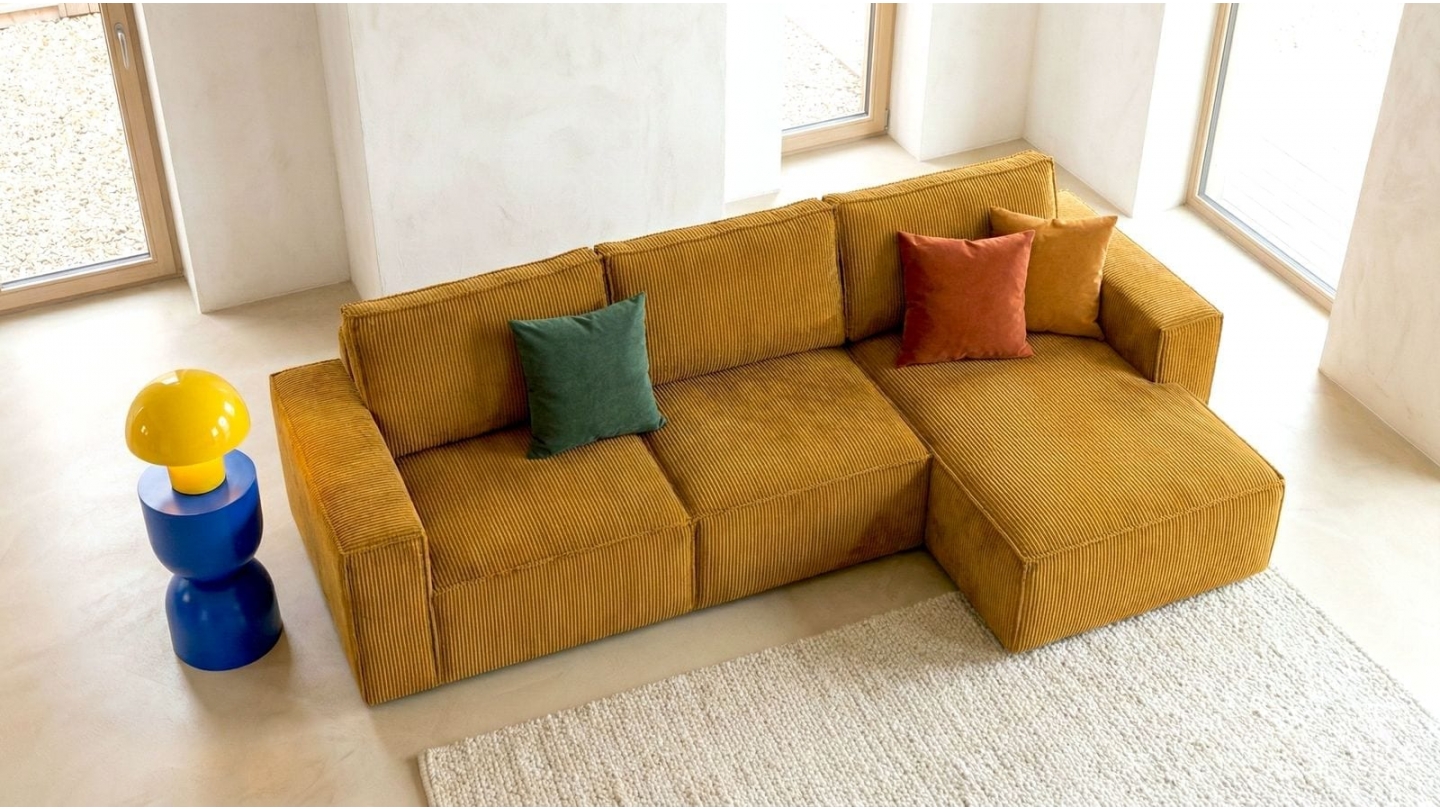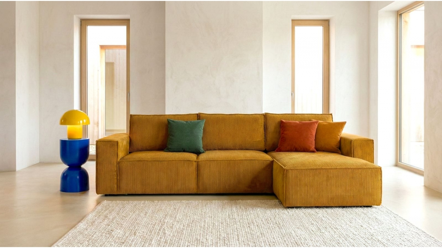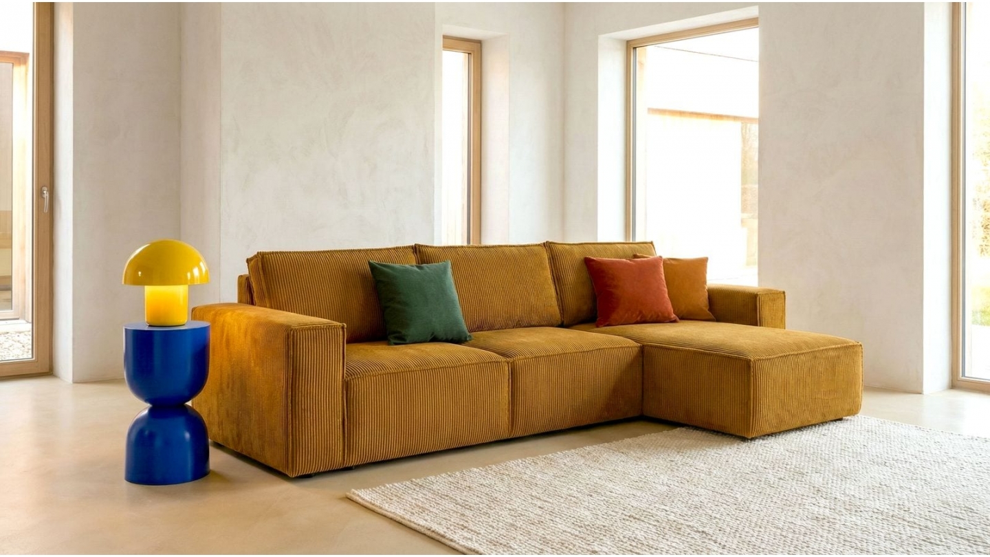 Vous n'avez pas encore succombez à la tendance du velours côtelé ? Craquez pour notre canapé d'angle convertible 5 places en velours côtelé jaune moutarde !