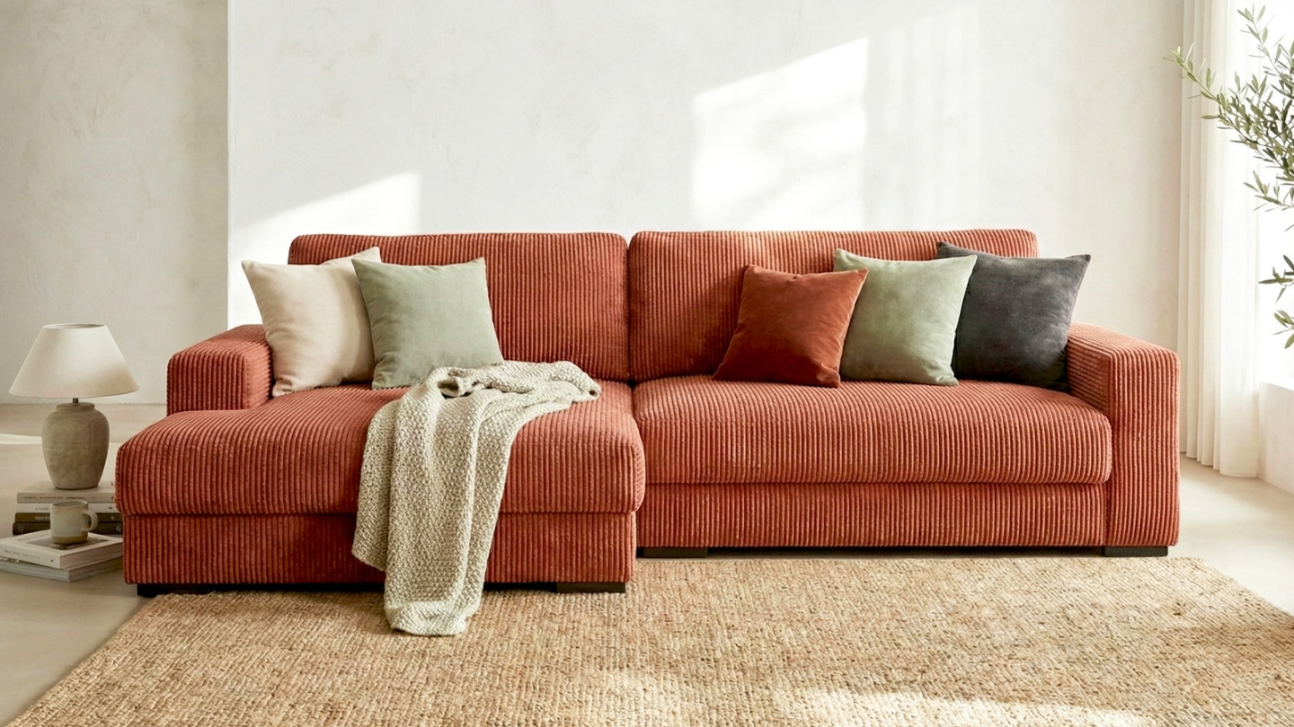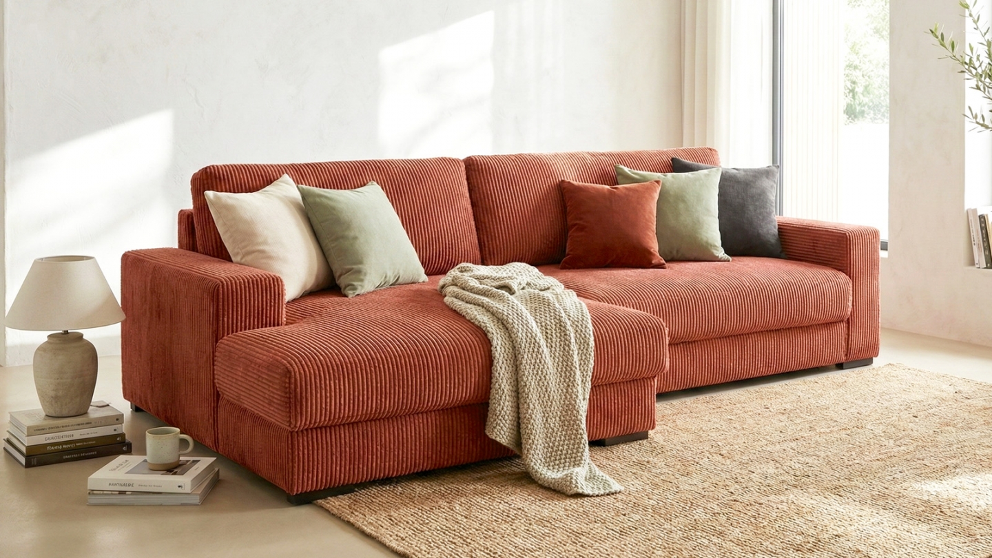Canapé d'angle convertible 3/4 places en velours côtelé rouille