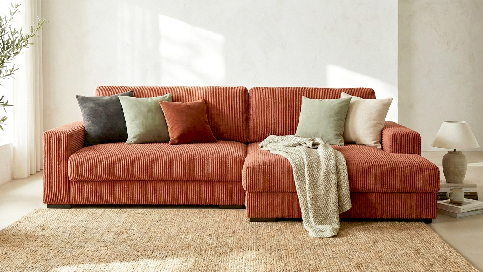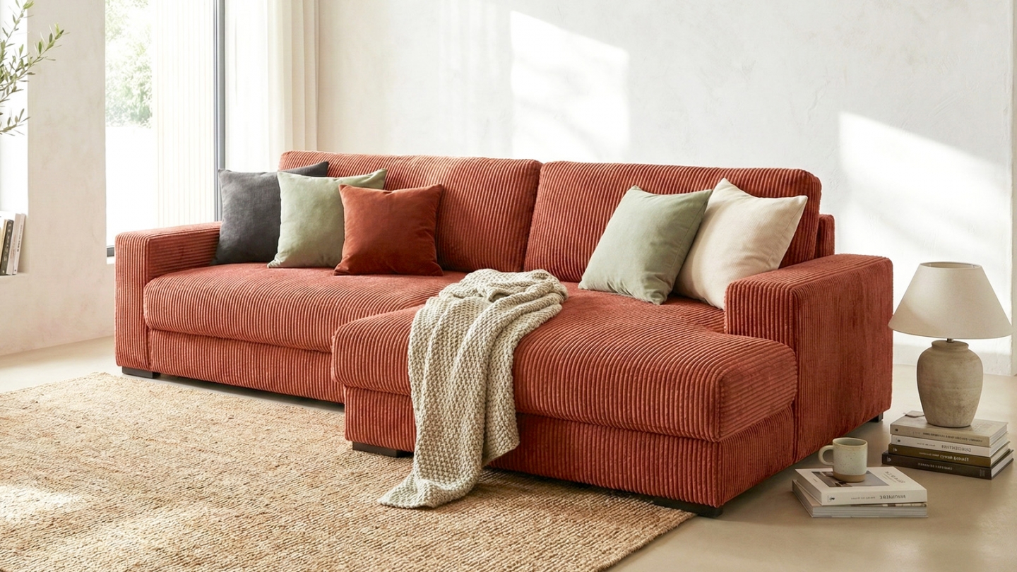 Canapé d'angle convertible 3/4 places en velours côtelé rouille