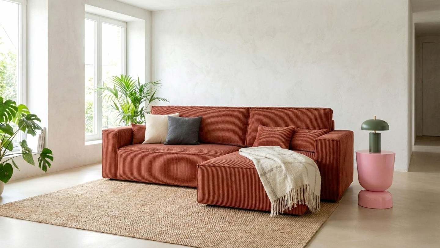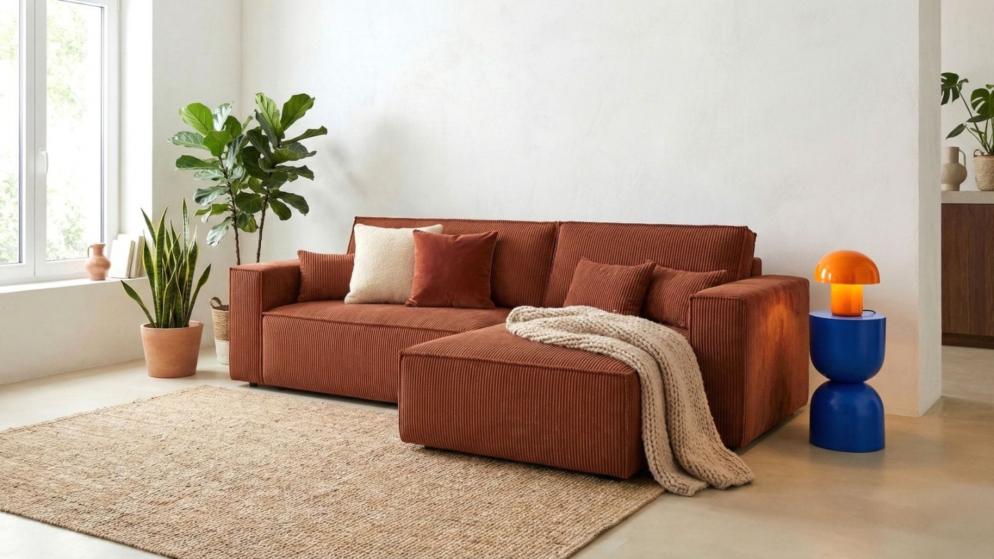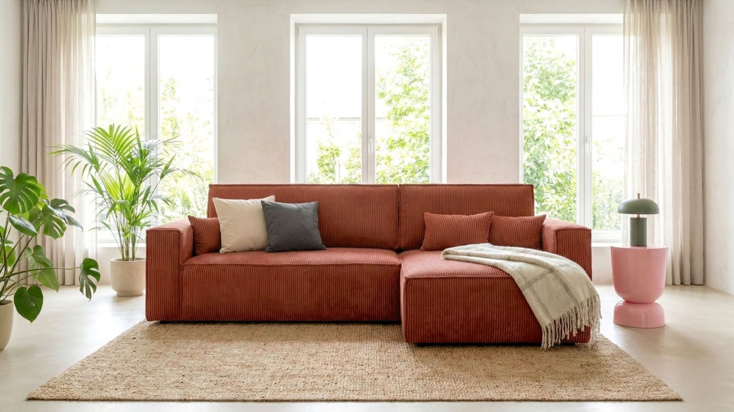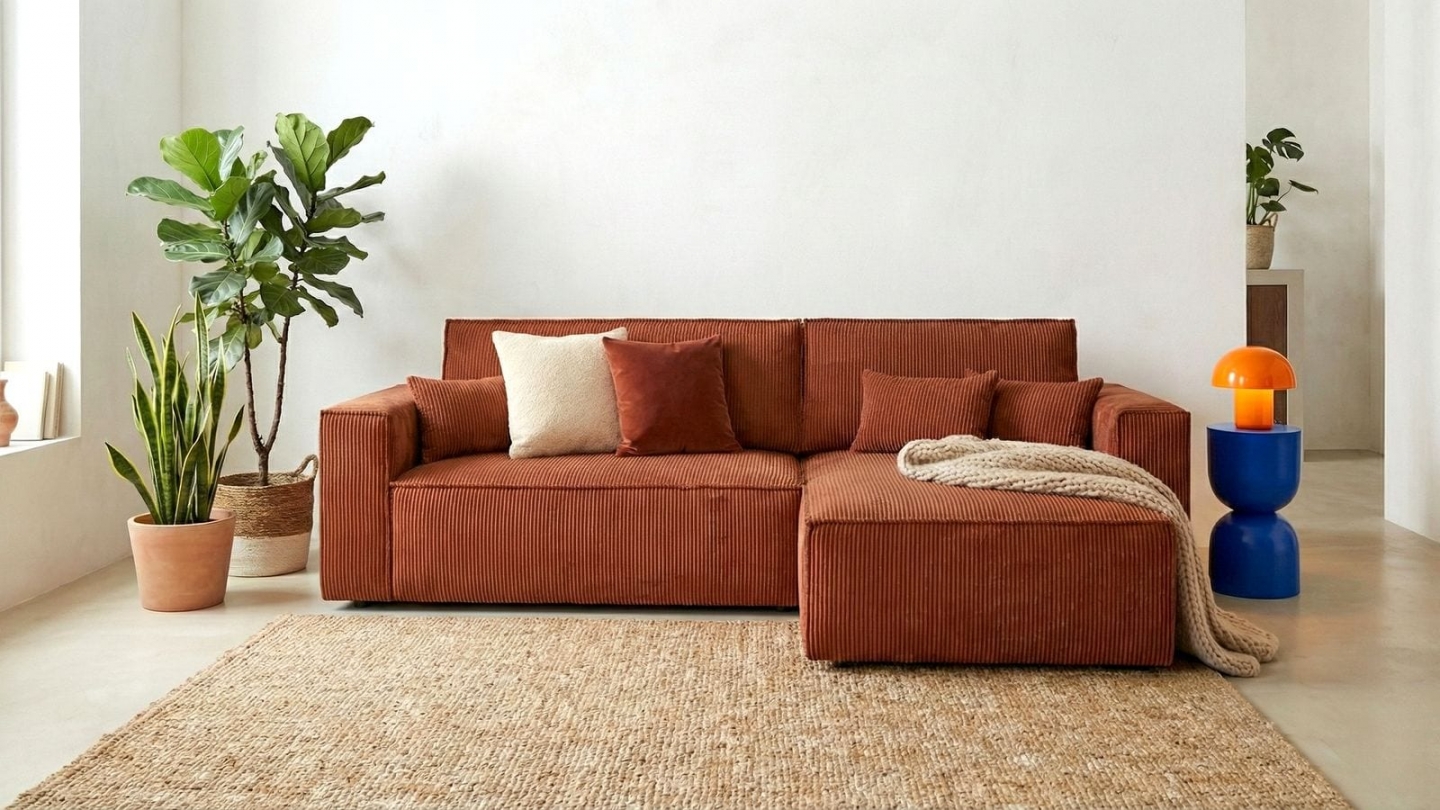 Découvrez le modèle Livia couleur rouille pour un canapé d'angle convertible 4 places en tissu velours côtelé 100% polyester certifié Oekotex® offrant un confort ultime et une élégance sans pareil.