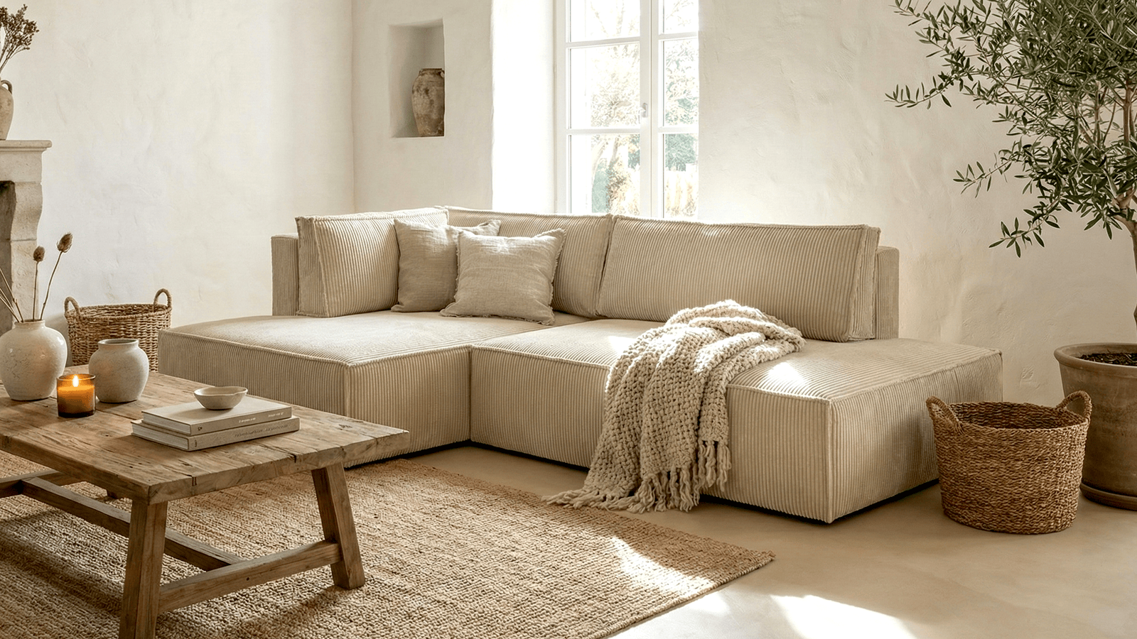 Canapé d'angle à gauche convertible en velours côtelé beige