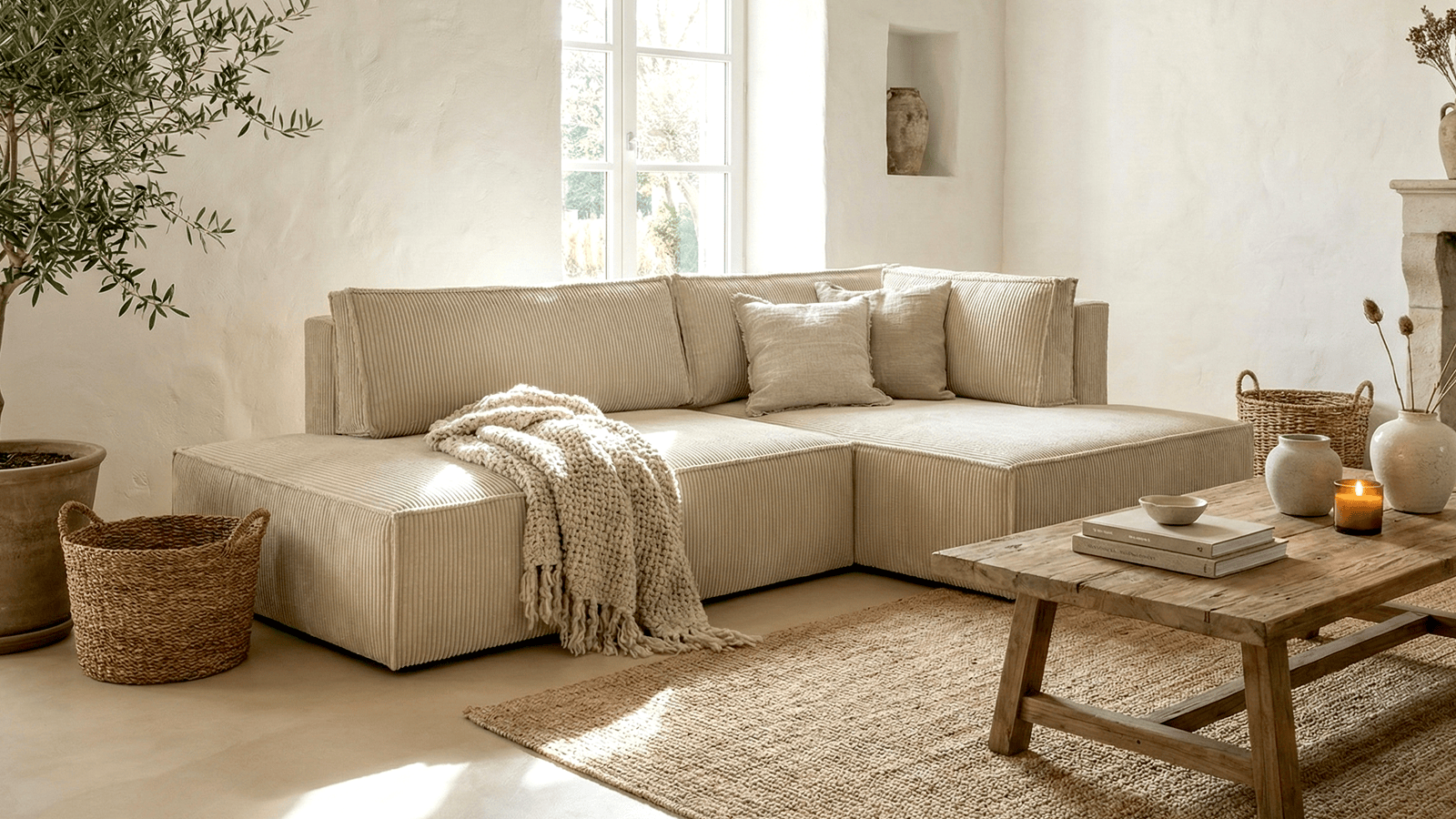 Le canapé d'angle convertible en velours côtelé beige est un choix idéal pour les familles nombreuses ou pour ceux qui aiment recevoir des invités.