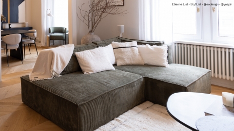 Le canapé d'angle à droite Barani en velours côtelé vert kaki est une option de mobilier élégante et pratique pour un salon moderne. Le revêtement en velours côtelé ajoute une texture intéressante à la pièce, tandis que la couleur verte apporte une touche de nature et de fraîcheur.