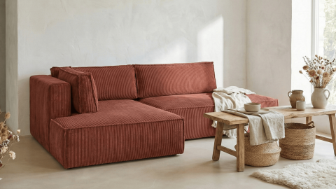 Le canapé Barani en velours côtelé rouille est à la fois esthétique et pratique.