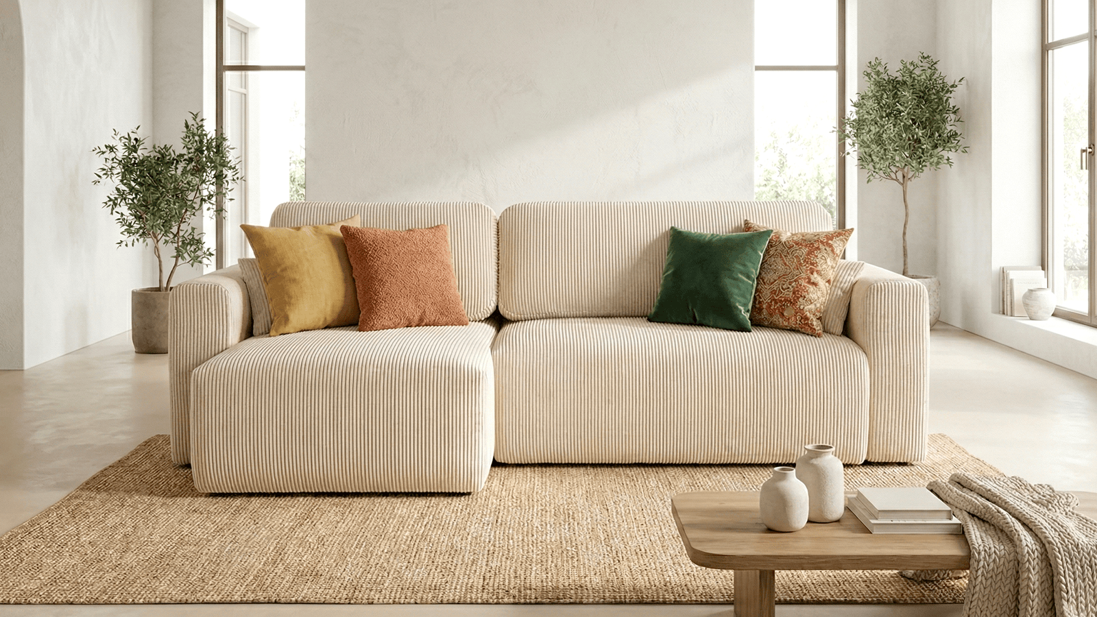 Redécouvrez le confort avec notre canapé d'angle convertible Davis 4 places en velours côtelé beige, alliant élégance, praticité et design moderne pour sublimer votre salon.
