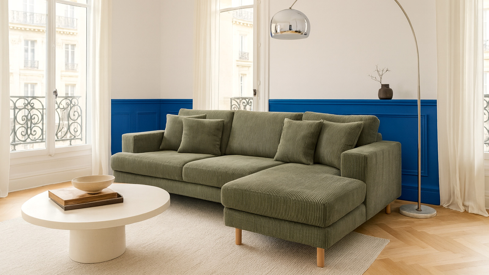 Canapé d'angle à droite convertible 4 places en velours côtelé vert kaki