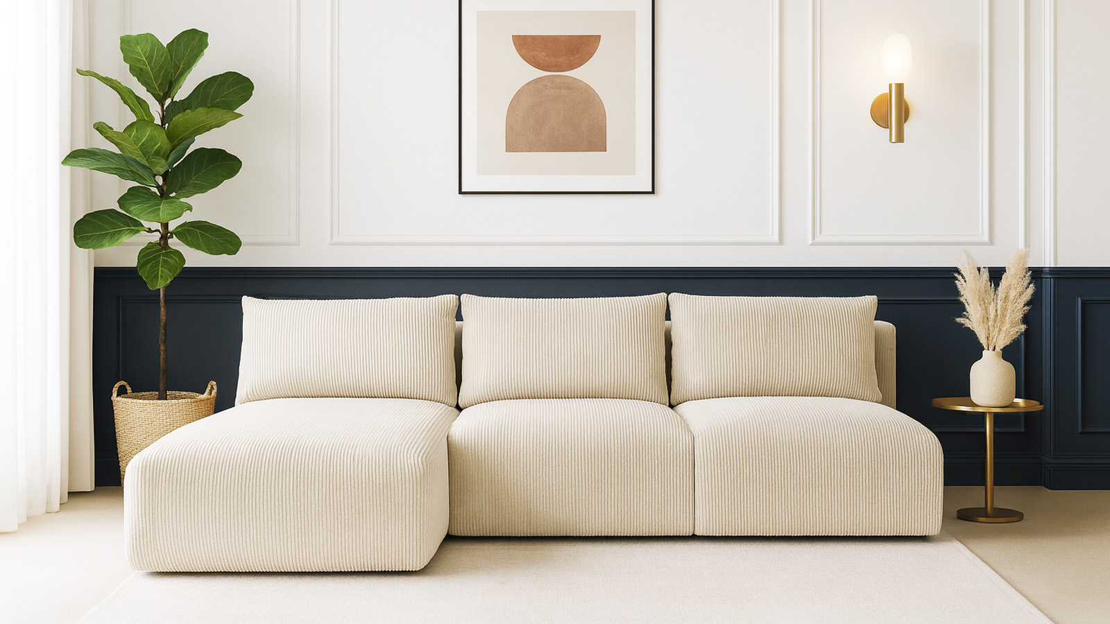Canapé d'angle convertible 4 places en velours côtelé beige