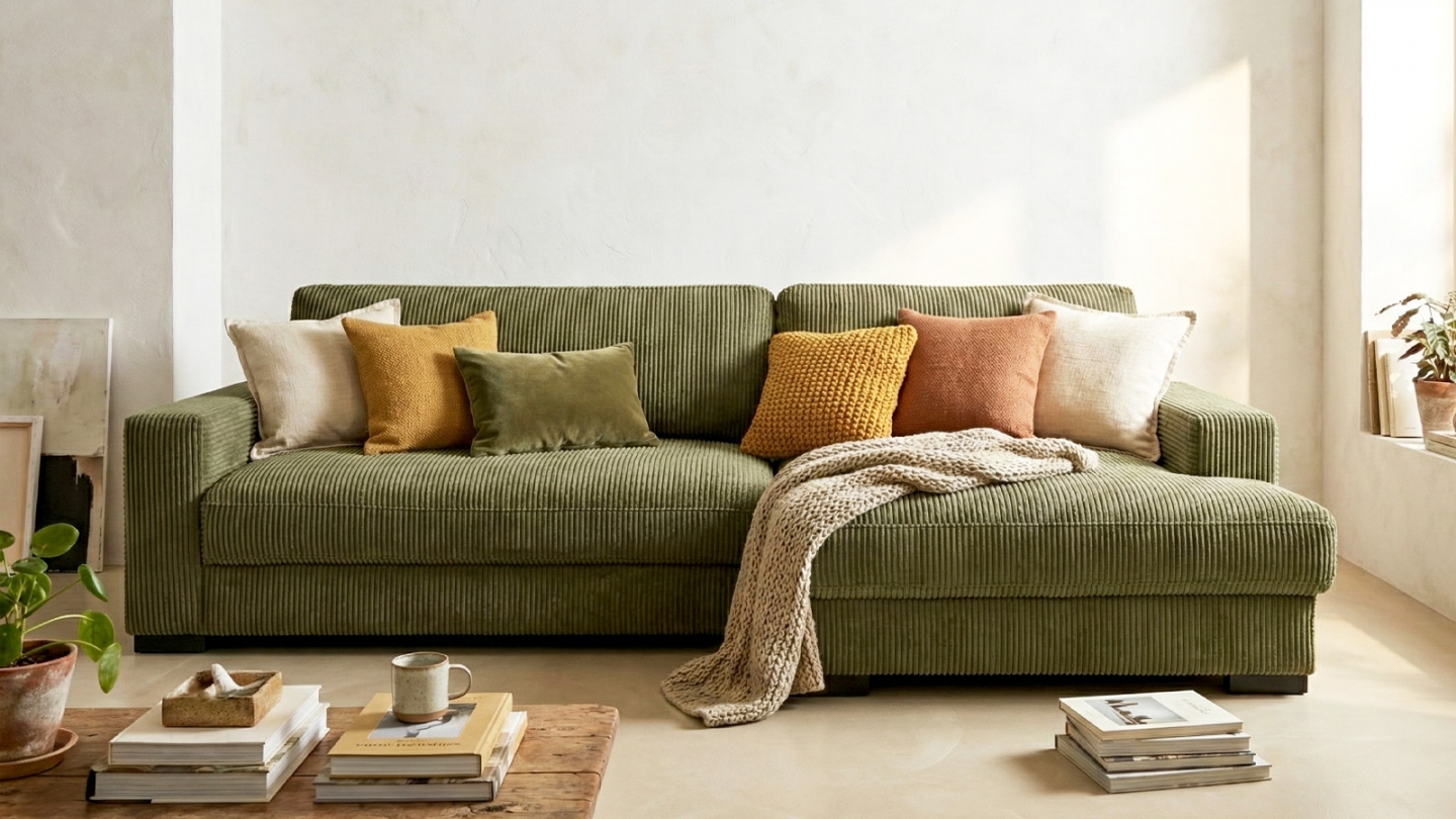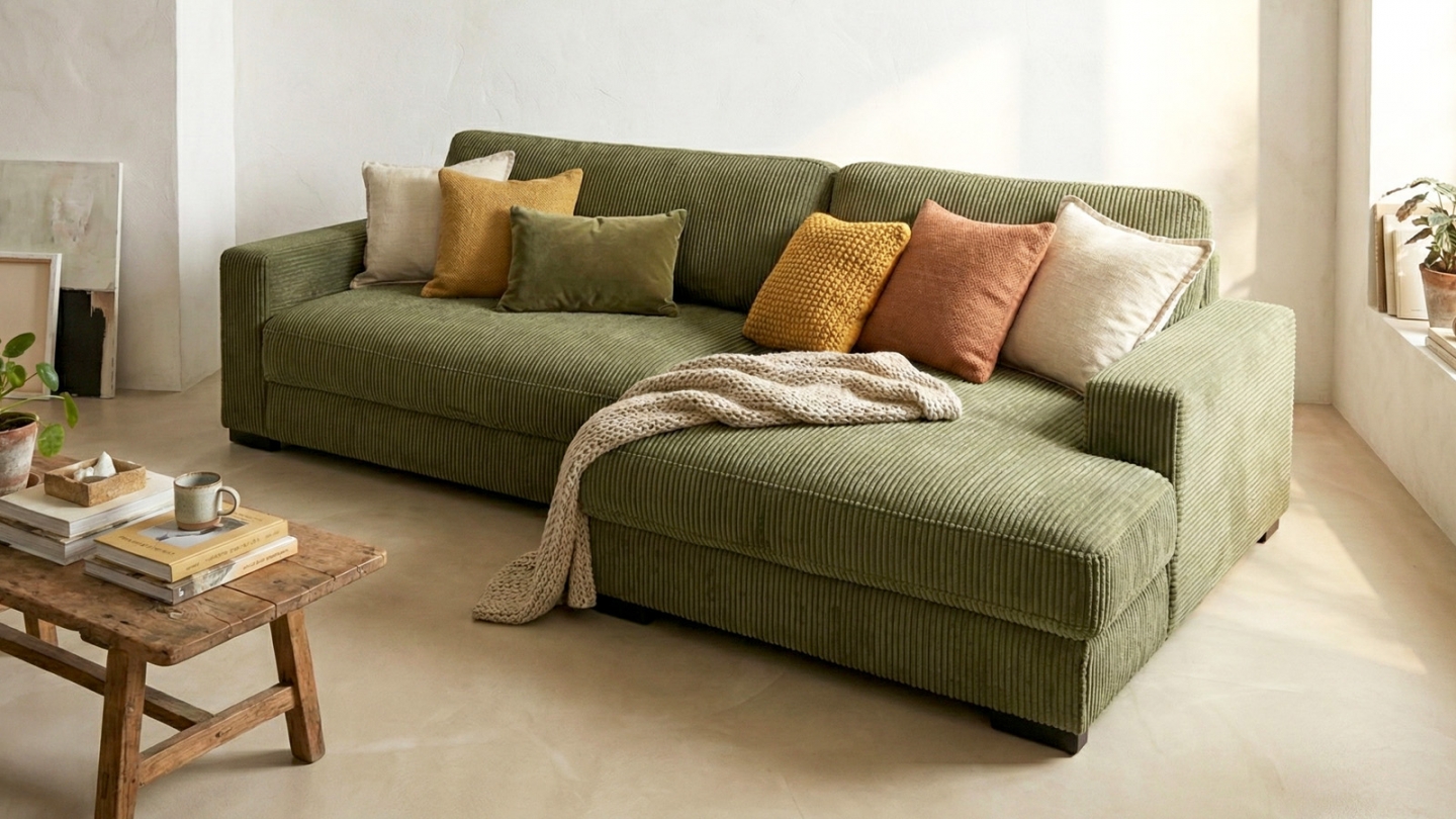 Canapé d'angle droit convertible 3 places en velours côtelé vert kaki - Arty