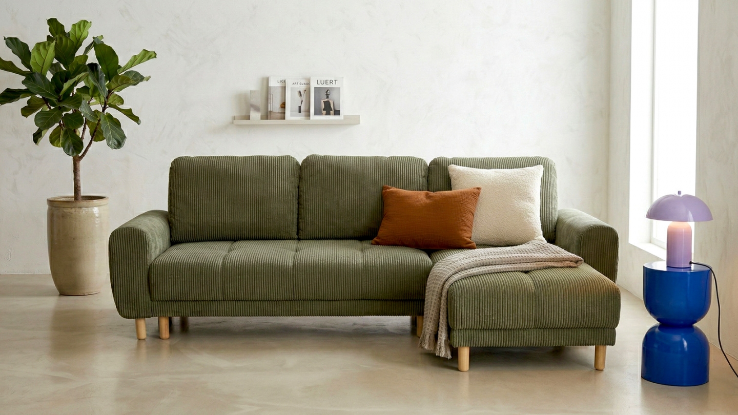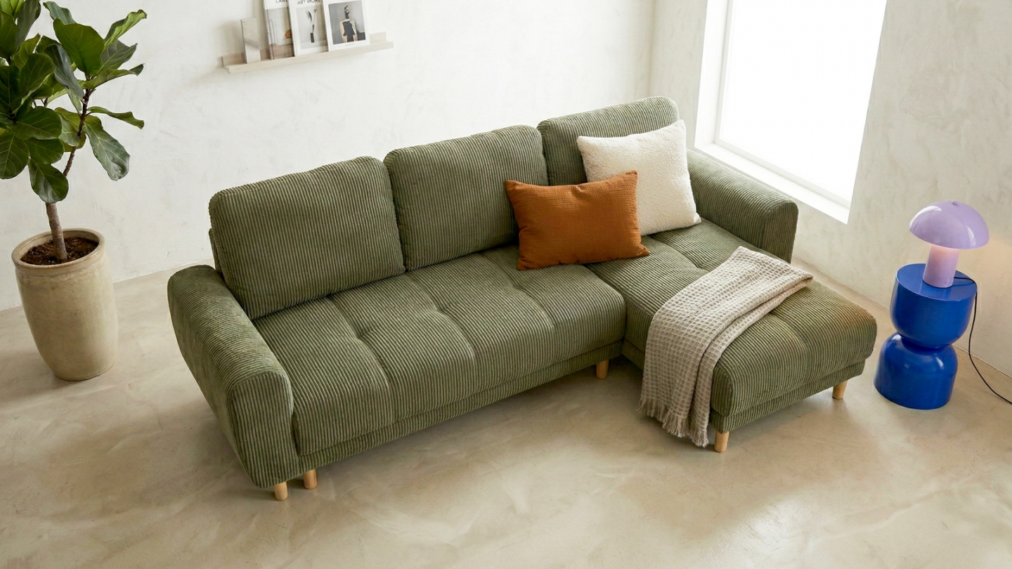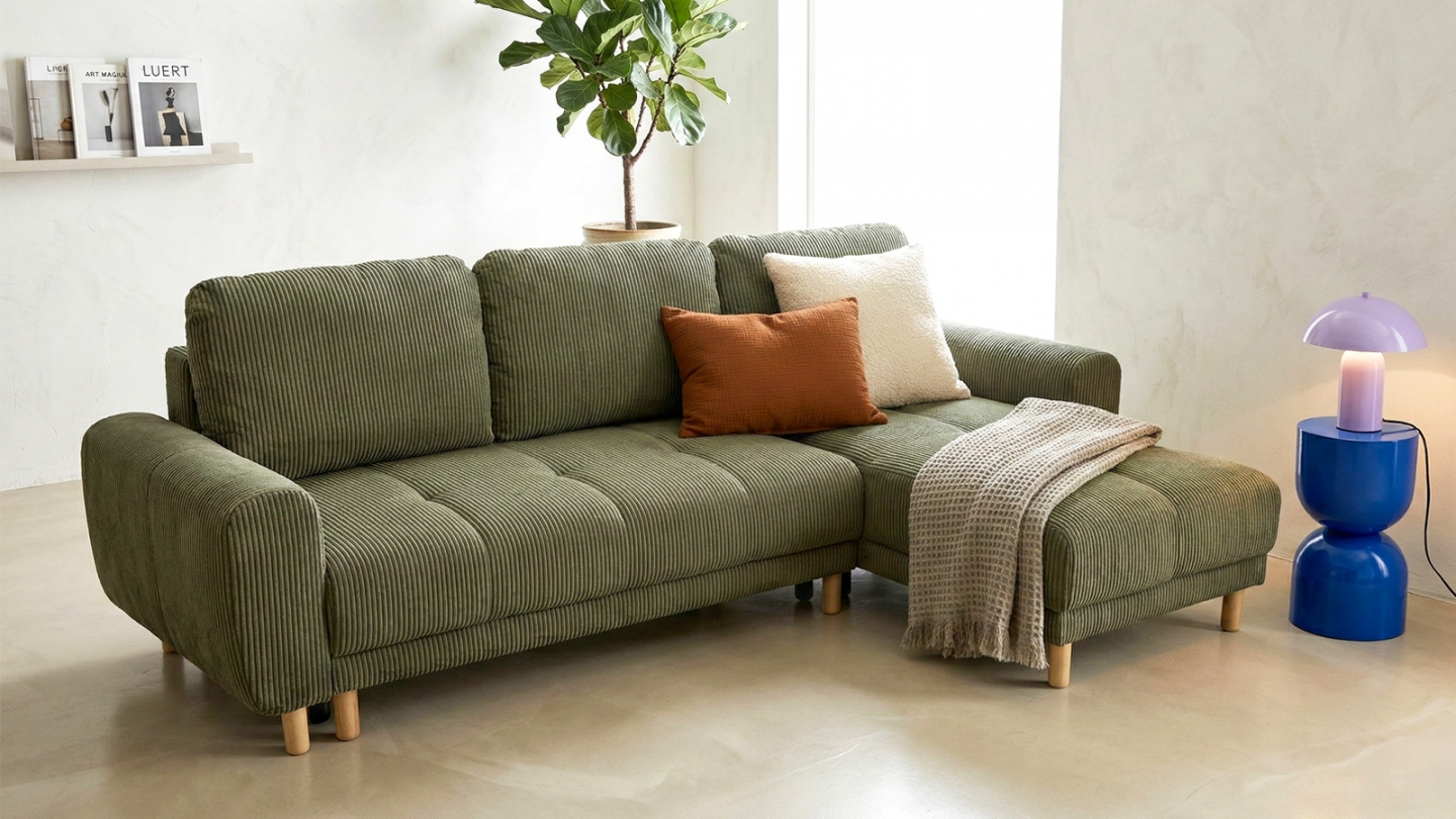 Avec sa silhouette généreuse, son velours côtelé vert kaki et son angle réversible, le canapé d'angle convertible Alva coche toutes les cases du meuble à vivre, pensé pour s’adapter à votre quotidien comme à vos envies.