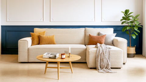 Avec son velours gros côtelé ultra doux et sa teinte beige lumineuse, le canapé d’angle Farrow incarne l’alliance parfaite entre confort et tendance. Il apporte une touche chaleureuse et texturée à votre salon, tout en s’adaptant à votre espace grâce à son angle réversible – à positionner à droite ou à gauche selon vos besoins.
