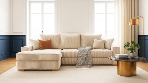 Avec ses lignes généreuses, son velours côtelé ultra tendance et son coloris beige intemporel, le canapé d’angle Nyssa s’impose comme la pièce maîtresse du séjour. À la fois élégant, cocooning et fonctionnel, il séduit par son look moderne et son confort d’accueil pensé pour un usage quotidien.