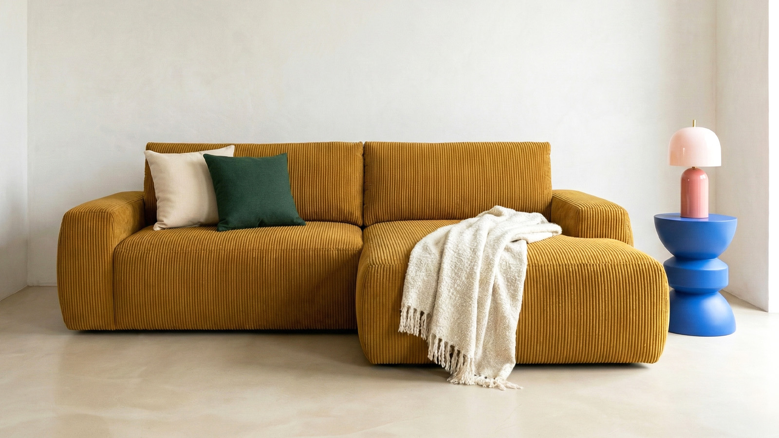 Canapé d'angle convertible 3 places - Sonny• Type d'angle : à droite (lorsqu'on se tient face au canapé)• Couleur : Beige• Revêtement : Velours côtelé certifié Oekotex• Structure : Pin massif certifié• Garnissage : Mousse de polyuréthane 30k g/m3• Confort : équilibré (accueil moelleux, soutien ferme)• Coussins de dossier déhoussables• 1 coffre de...