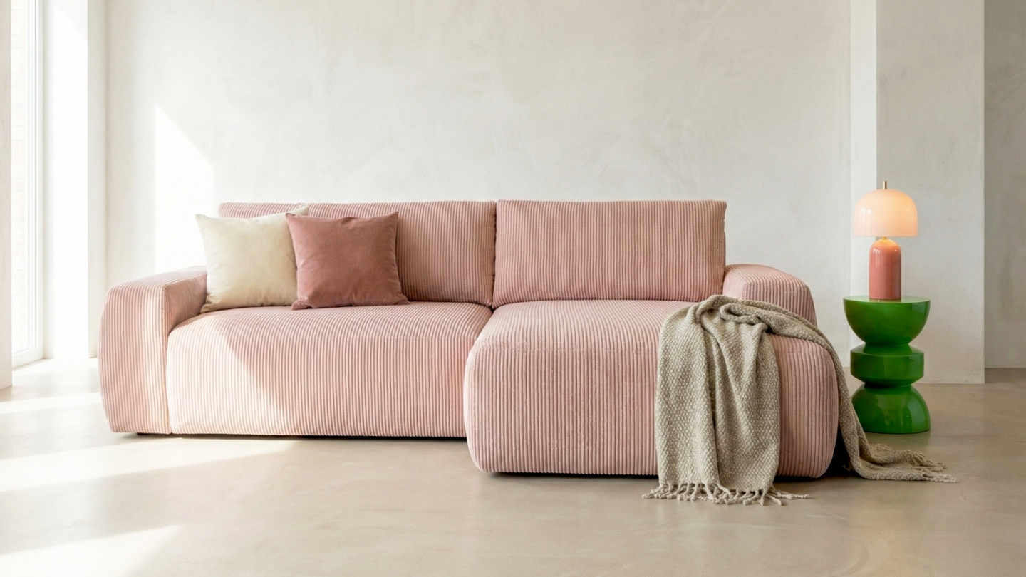 Canapé d'angle convertible 3 places - Sonny• Type d'angle : à droite (lorsqu'on se tient face au canapé)• Couleur : Beige• Revêtement : Velours côtelé certifié Oekotex• Structure : Pin massif certifié• Garnissage : Mousse de polyuréthane 30k g/m3• Confort : équilibré (accueil moelleux, soutien ferme)• Coussins de dossier déhoussables• 1 coffre de...