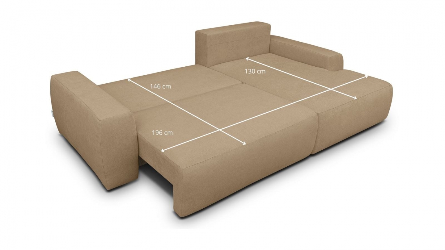 Canapé d'angle convertible 3 places - Sonny• Type d'angle : à droite (lorsqu'on se tient face au canapé)• Couleur : Beige• Revêtement : Tissu chenille 100% polyester 310 g/m² certifié Oekotex• Structure : Pin massif certifié• Garnissage : Mousse de polyuréthane 30k g/m3• Confort : équilibré (accueil moelleux, soutien ferme)• Coussins de dossier...