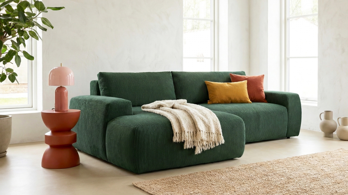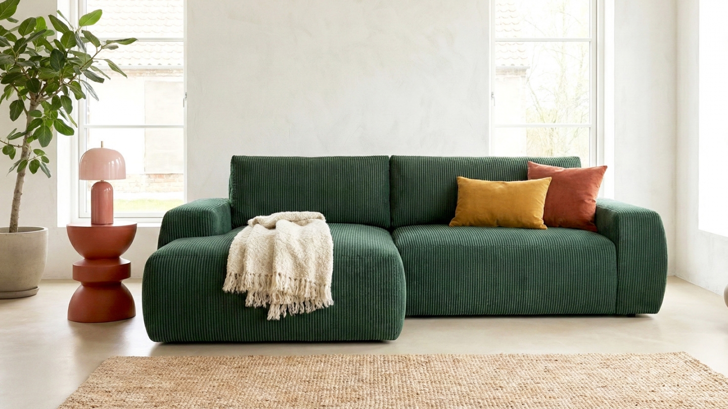 En stockCanapé d'angle convertible 3 places - Sonny• Type d'angle : à droite (lorsqu'on se tient face au canapé)• Couleur : Vert kaki• Revêtement : Velours côtelé certifié Oekotex• Structure : Pin massif certifié• Garnissage : Mousse de polyuréthane 30k g/m3• Confort : équilibré (accueil moelleux, soutien ferme)• Coussins de dossier déhoussables• 1 coffre de...