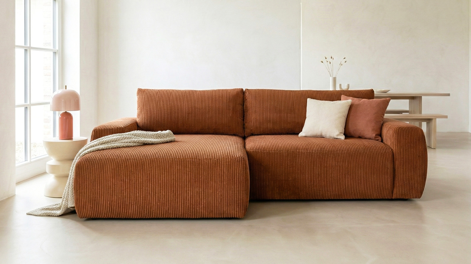 Canapé d'angle convertible 3 places - Sonny• Type d'angle : à droite (lorsqu'on se tient face au canapé)• Couleur : Beige• Revêtement : Velours côtelé certifié Oekotex• Structure : Pin massif certifié• Garnissage : Mousse de polyuréthane 30k g/m3• Confort : équilibré (accueil moelleux, soutien ferme)• Coussins de dossier déhoussables• 1 coffre de...