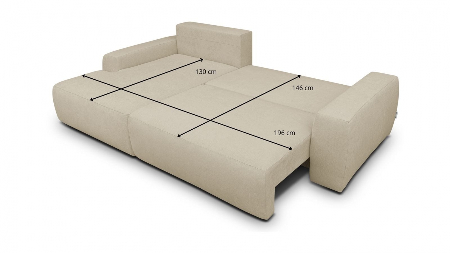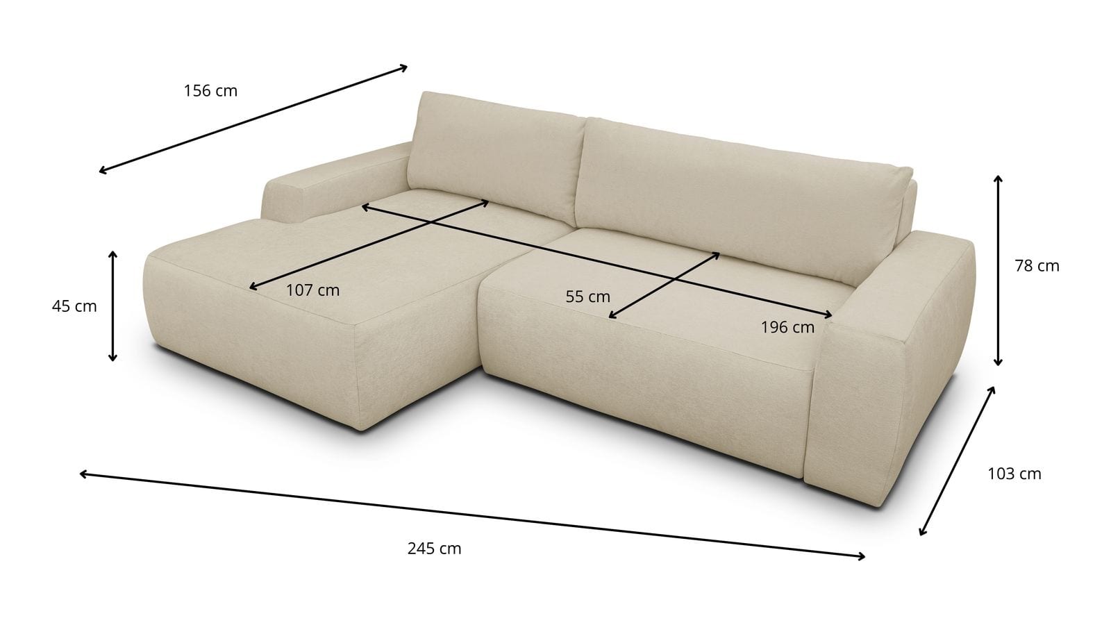 Canapé d'angle convertible 3 places - Sonny• Type d'angle : à droite (lorsqu'on se tient face au canapé)• Couleur : Beige• Revêtement : Velours côtelé certifié Oekotex• Structure : Pin massif certifié• Garnissage : Mousse de polyuréthane 30k g/m3• Confort : équilibré (accueil moelleux, soutien ferme)• Coussins de dossier déhoussables• 1 coffre de...