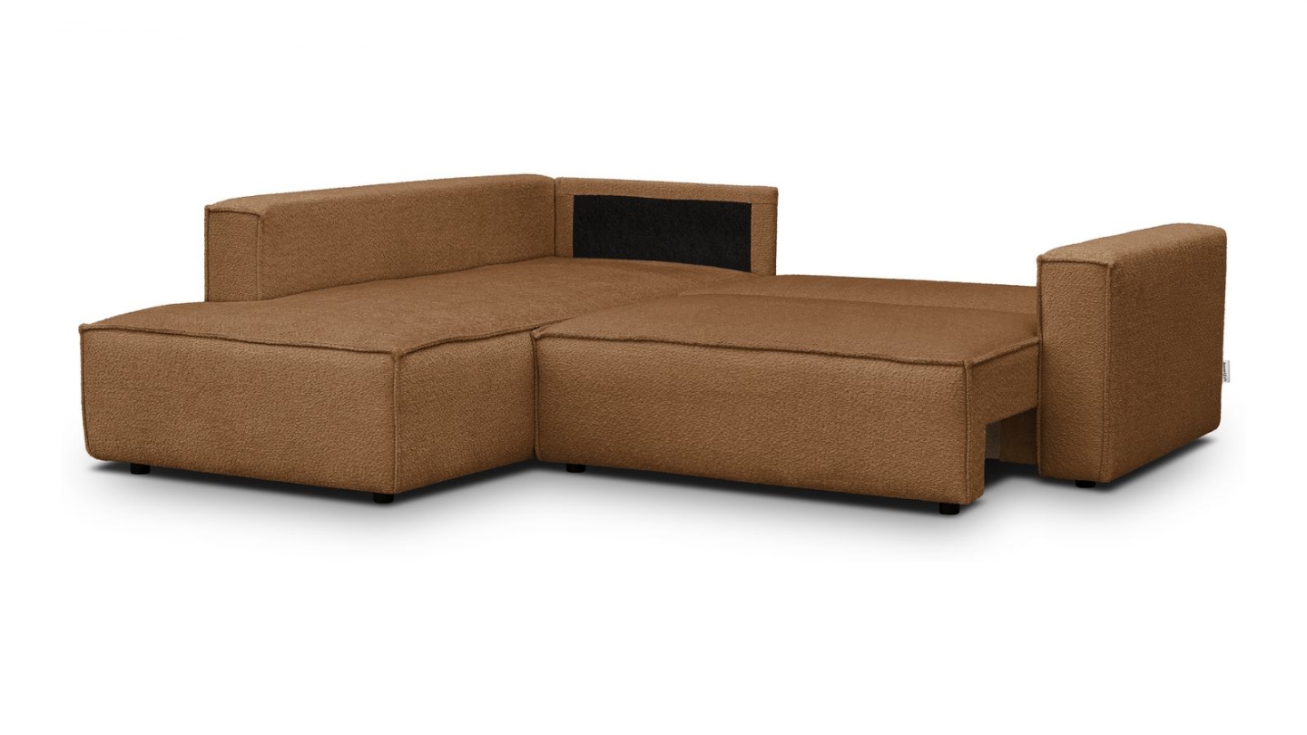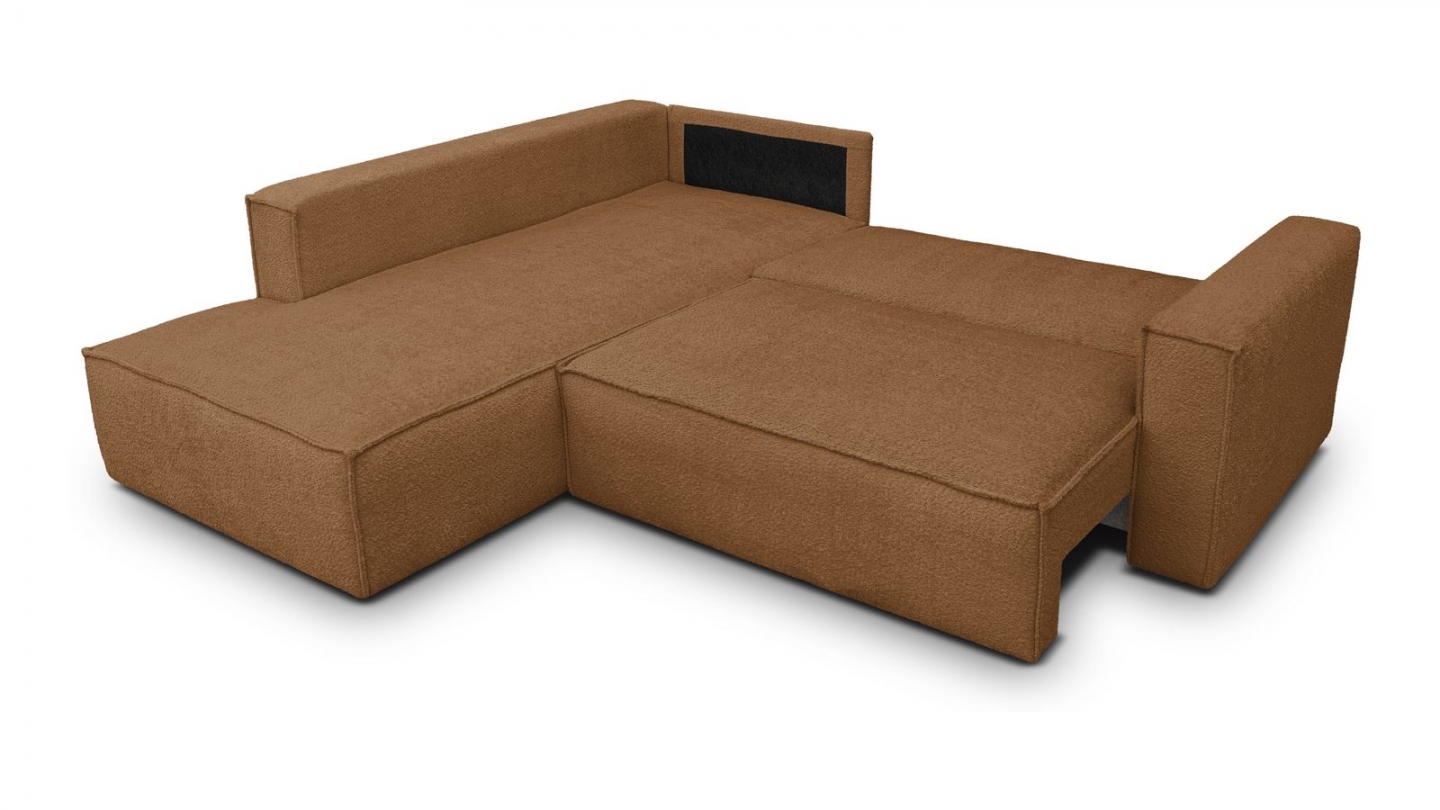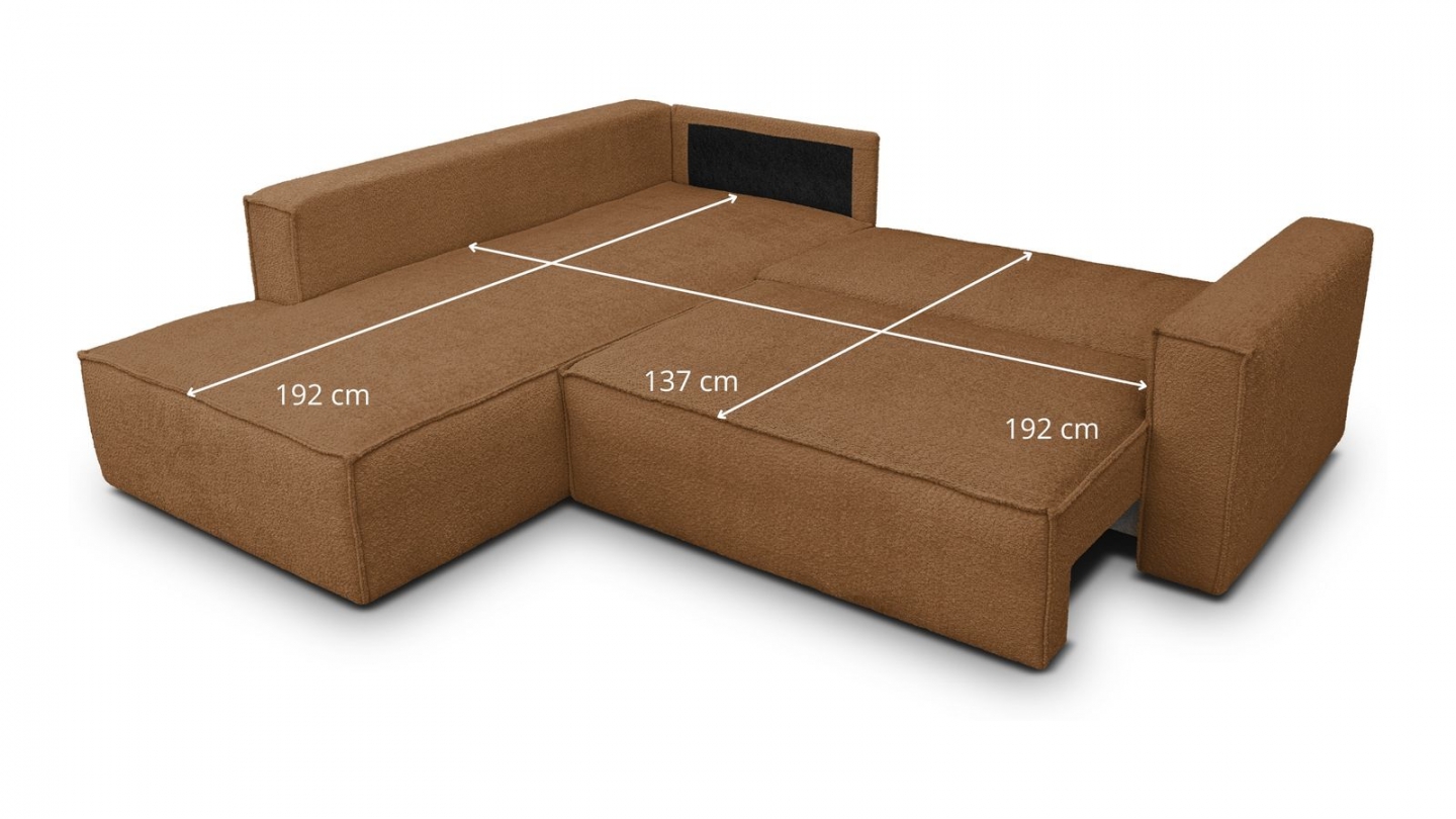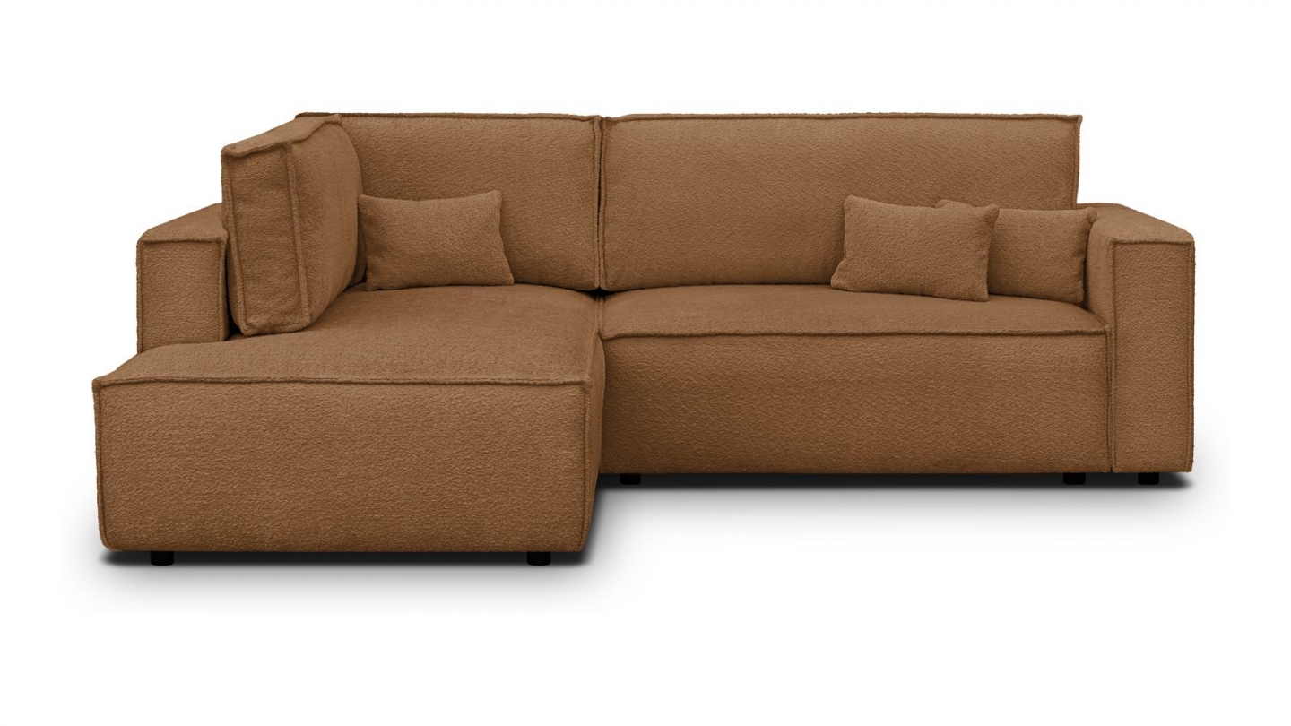 Canapé d'angle ouvert à gauche convertible 3 places en tissu bouclé rouille est un canapé pensé pour le confort quotidien et l'élégance du salon. Son revêtement en tissu bouclé 100% polyester 440 g/m² certifié oekotex offre une texture agréable au toucher et une résistance appréciable dans le temps. La teinte rouille s'intègre avec naturel dans de nombreuses ambiances déco, du style scandinave au décor contemporain. Sa structure en pin massif certifié garantit une solidité durable pour un usage intensif au quotidien. Son garnissage en mousse de polyuréthane 30 kg/m3 assure un confort équilibré, moelleux à l'accueil et ferme au soutien. Une fois déplié, il offre un couchage de 137 x 192 cm, parfait pour accueillir vos invités dans le confort. Son coffre de rangement intégré permet de ranger plaids et linge de lit discrètement sous l'assise. L'angle structure naturellement l'espace et délimite une zone salon confortable et conviviale. Avec des dimensions totales de 231 x 199 x 82 cm, il s'intègre aussi bien dans les grands espaces que dans les pièces à vivre de taille intermédiaire. Fabriqué en Europe, il répond aux exigences de qualité les plus strictes.