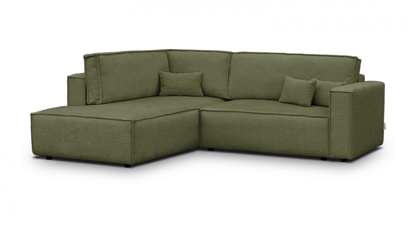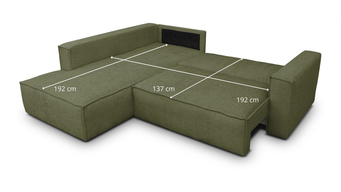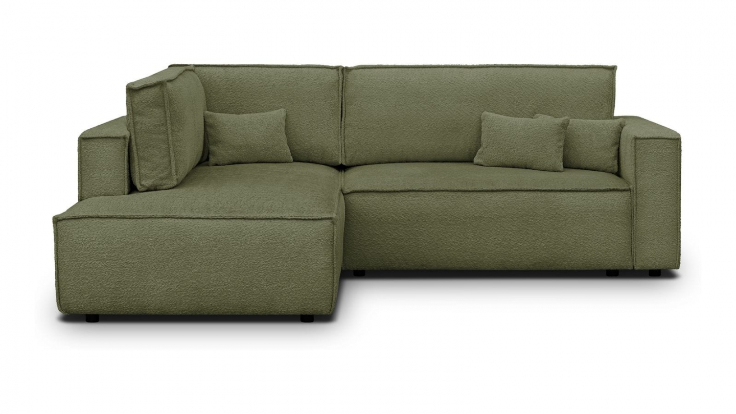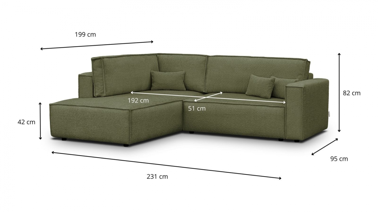 Canapé d'angle ouvert à gauche convertible 3 places en tissu bouclé vert olive est un canapé pensé pour le confort quotidien et l'élégance du salon. Son revêtement en tissu bouclé 100% polyester 440 g/m² certifié oekotex offre une texture agréable au toucher et une résistance appréciable dans le temps. La teinte vert olive s'intègre avec naturel dans de nombreuses ambiances déco, du style scandinave au décor contemporain. Sa structure en pin massif certifié garantit une solidité durable pour un usage intensif au quotidien. Son garnissage en mousse de polyuréthane 30 kg/m3 assure un confort équilibré, moelleux à l'accueil et ferme au soutien. Une fois déplié, il offre un couchage de 137 x 192 cm, parfait pour accueillir vos invités dans le confort. Son coffre de rangement intégré permet de ranger plaids et linge de lit discrètement sous l'assise. L'angle structure naturellement l'espace et délimite une zone salon confortable et conviviale. Avec des dimensions totales de 231 x 199 x 82 cm, il s'intègre aussi bien dans les grands espaces que dans les pièces à vivre de taille intermédiaire. Fabriqué en Europe, il répond aux exigences de qualité les plus strictes.