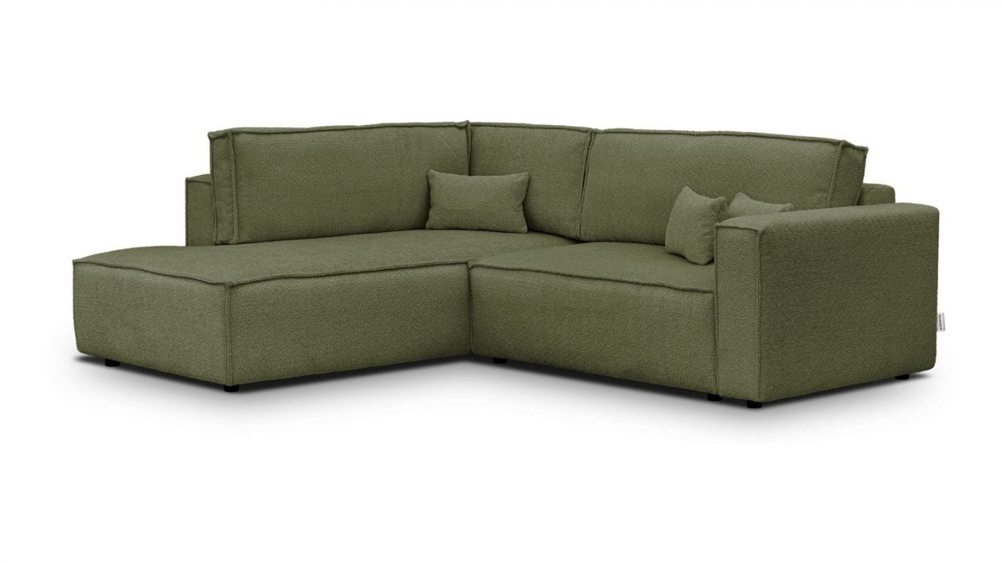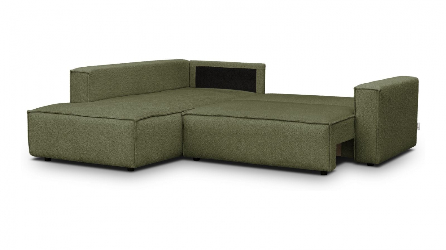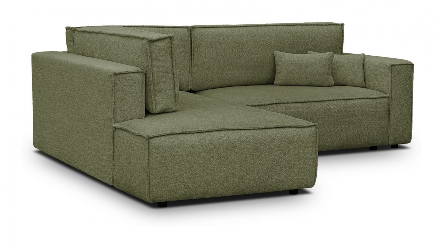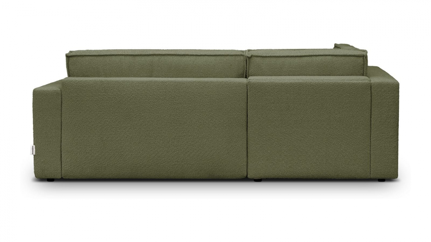 Canapé d'angle ouvert à gauche convertible 3 places en tissu bouclé vert olive est un canapé pensé pour le confort quotidien et l'élégance du salon. Son revêtement en tissu bouclé 100% polyester 440 g/m² certifié oekotex offre une texture agréable au toucher et une résistance appréciable dans le temps. La teinte vert olive s'intègre avec naturel dans de nombreuses ambiances déco, du style scandinave au décor contemporain. Sa structure en pin massif certifié garantit une solidité durable pour un usage intensif au quotidien. Son garnissage en mousse de polyuréthane 30 kg/m3 assure un confort équilibré, moelleux à l'accueil et ferme au soutien. Une fois déplié, il offre un couchage de 137 x 192 cm, parfait pour accueillir vos invités dans le confort. Son coffre de rangement intégré permet de ranger plaids et linge de lit discrètement sous l'assise. L'angle structure naturellement l'espace et délimite une zone salon confortable et conviviale. Avec des dimensions totales de 231 x 199 x 82 cm, il s'intègre aussi bien dans les grands espaces que dans les pièces à vivre de taille intermédiaire. Fabriqué en Europe, il répond aux exigences de qualité les plus strictes.