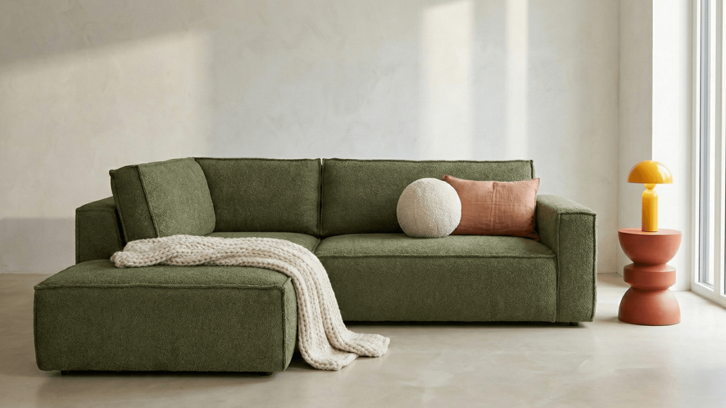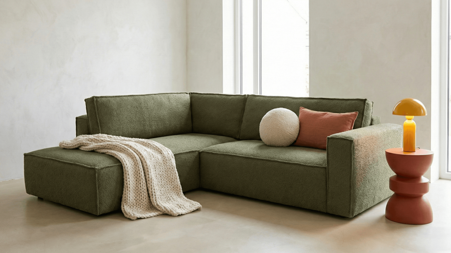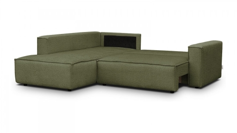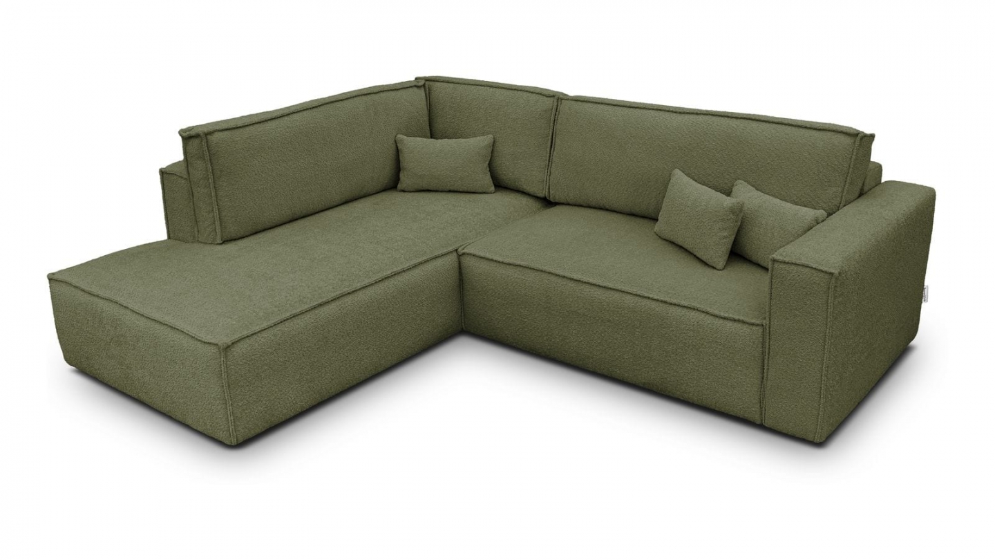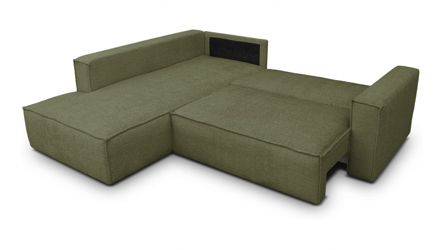 Canapé d'angle ouvert à gauche convertible 3 places en tissu bouclé vert olive est un canapé pensé pour le confort quotidien et l'élégance du salon. Son revêtement en tissu bouclé 100% polyester 440 g/m² certifié oekotex offre une texture agréable au toucher et une résistance appréciable dans le temps. La teinte vert olive s'intègre avec naturel dans de nombreuses ambiances déco, du style scandinave au décor contemporain. Sa structure en pin massif certifié garantit une solidité durable pour un usage intensif au quotidien. Son garnissage en mousse de polyuréthane 30 kg/m3 assure un confort équilibré, moelleux à l'accueil et ferme au soutien. Une fois déplié, il offre un couchage de 137 x 192 cm, parfait pour accueillir vos invités dans le confort. Son coffre de rangement intégré permet de ranger plaids et linge de lit discrètement sous l'assise. L'angle structure naturellement l'espace et délimite une zone salon confortable et conviviale. Avec des dimensions totales de 231 x 199 x 82 cm, il s'intègre aussi bien dans les grands espaces que dans les pièces à vivre de taille intermédiaire. Fabriqué en Europe, il répond aux exigences de qualité les plus strictes.
