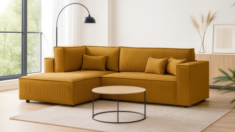 Le canapé d’angle convertible Emma combine confort, praticité et design moderne pour s’adapter à toutes les envies. Conçu en Europe, il séduit par ses lignes sobres et sa conception soignée. Son revêtement en velours côtelé jaune moutarde certifié Oeko-Tex et Petfriendly apporte une touche lumineuse à votre intérieur, créant une atmosphère chaleureuse et accueillante.