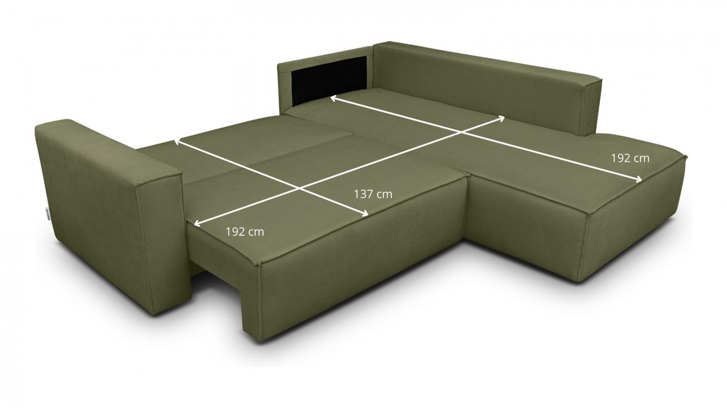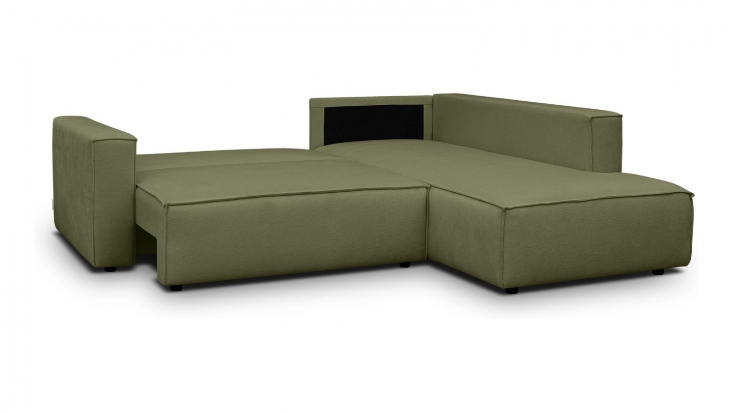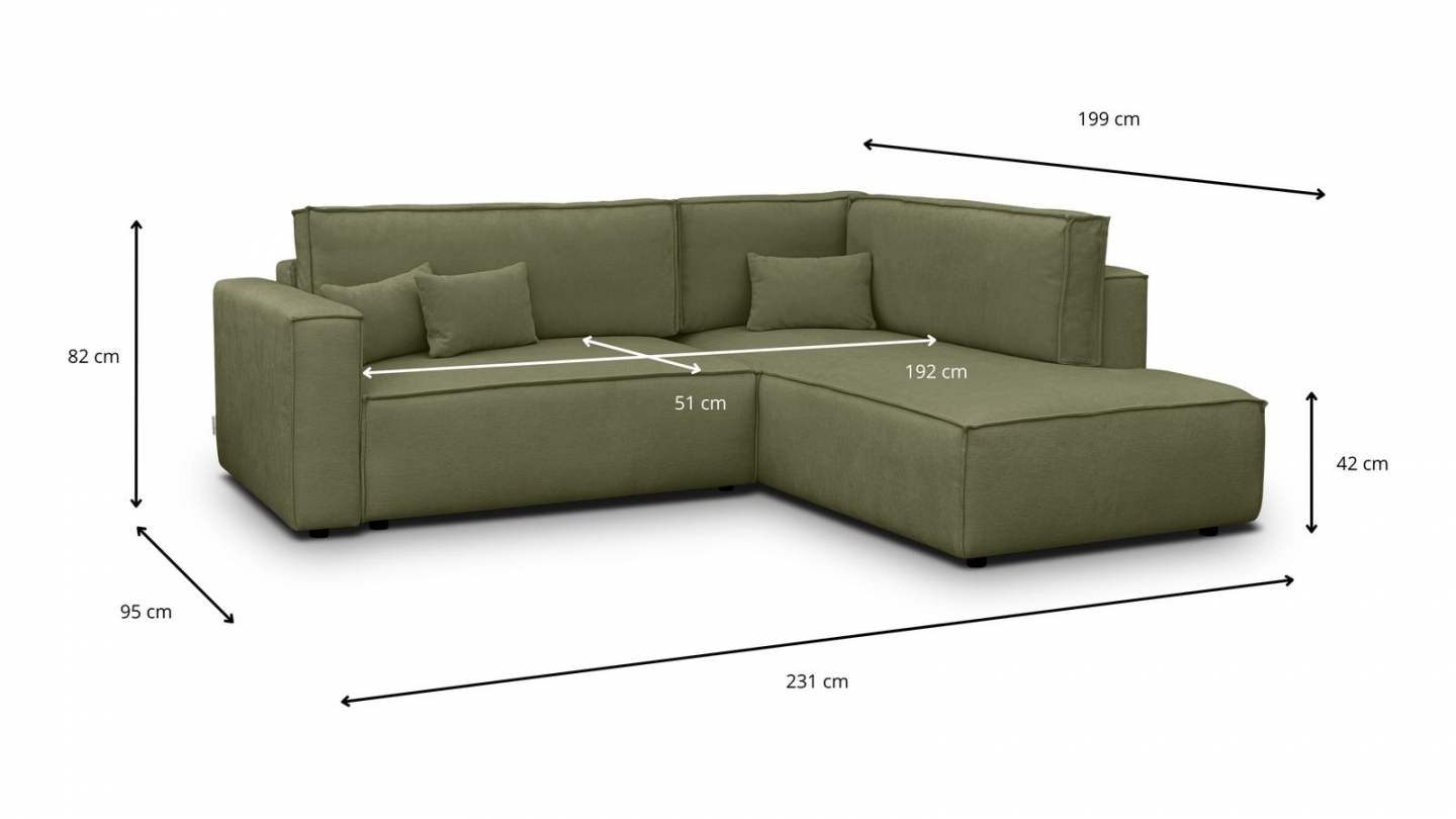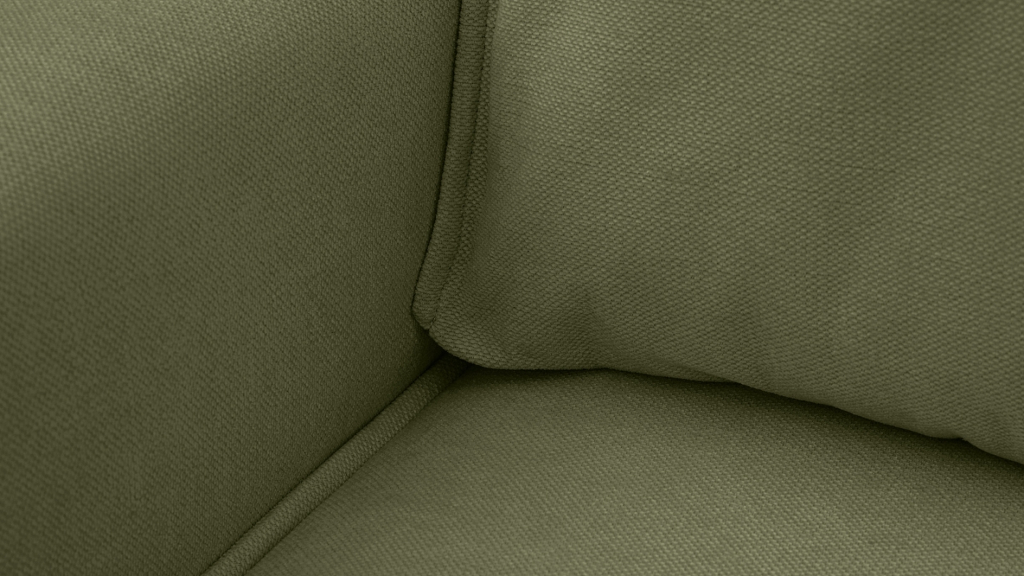 Canapé d'angle convertible 3 places - Emma • Confort : équilibré : accueil moelleux, soutien ferme • Couleur : vert olive • Revêtement : tissu chenille • certifié Oekotex - Petfriendly • Angle à gauche (lorsque• on est face au canapé) • Coffre de rangement sous l• assise, pratique pour ranger plaids, couettes etc. • Structure en bois massif certifié •...
