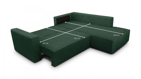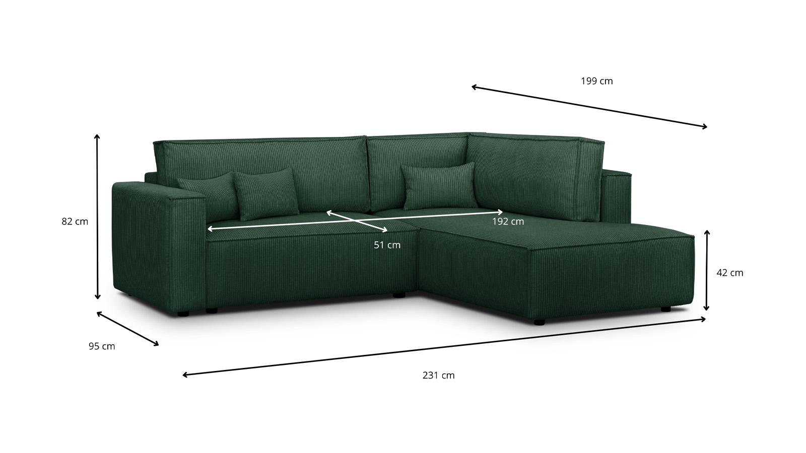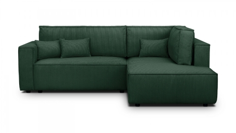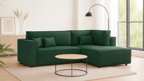 Le canapé d’angle convertible Emma combine confort, praticité et design moderne pour s’adapter à toutes les envies. Conçu en Europe, il séduit par ses lignes sobres et sa conception soignée. Son revêtement en velours côtelé vert certifié Oeko-Tex et Petfriendly apporte une note élégante et naturelle, idéale pour créer une atmosphère chaleureuse et apaisante dans le salon.