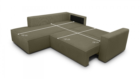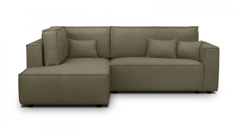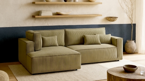 Le canapé d’angle convertible Emma combine confort, praticité et design moderne pour s’adapter à toutes les envies. Conçu en Europe, il séduit par ses lignes sobres et sa conception soignée. Son revêtement en velours côtelé vert kaki certifié Oeko-Tex et Petfriendly apporte une note élégante et naturelle, idéale pour créer une atmosphère chaleureuse et apaisante dans le salon.