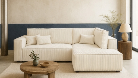 Le canapé d’angle convertible Emma combine confort, praticité et design moderne pour s’adapter à toutes les envies. Conçu en Europe, il séduit par ses lignes sobres et sa conception soignée. Son revêtement en velours côtelé beige certifié Oeko-Tex et Petfriendly apporte une touche lumineuse à votre intérieur, créant une atmosphère chaleureuse et accueillante.