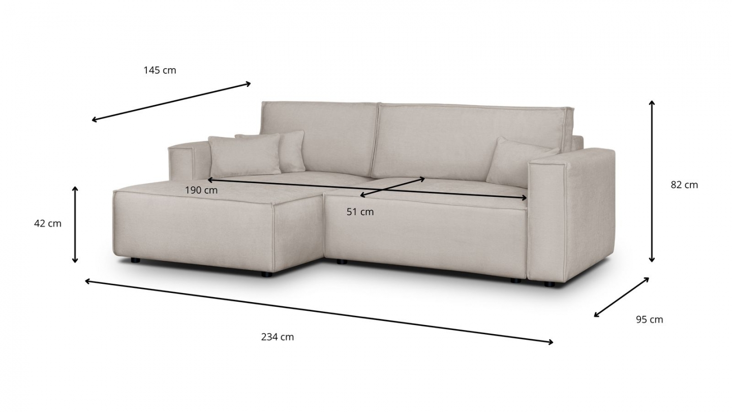 Avec ses dimensions de 234 x 145 x 82 cm, il trouve facilement sa place dans votre pièce à vivre, tout en affirmant son style. Et comme chaque détail compte, 3 coussins déco assortis sont inclus pour peaufiner l’ensemble.