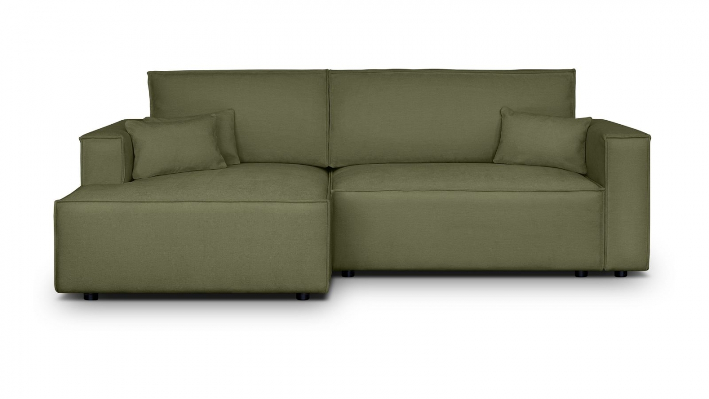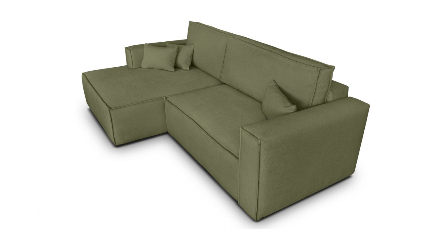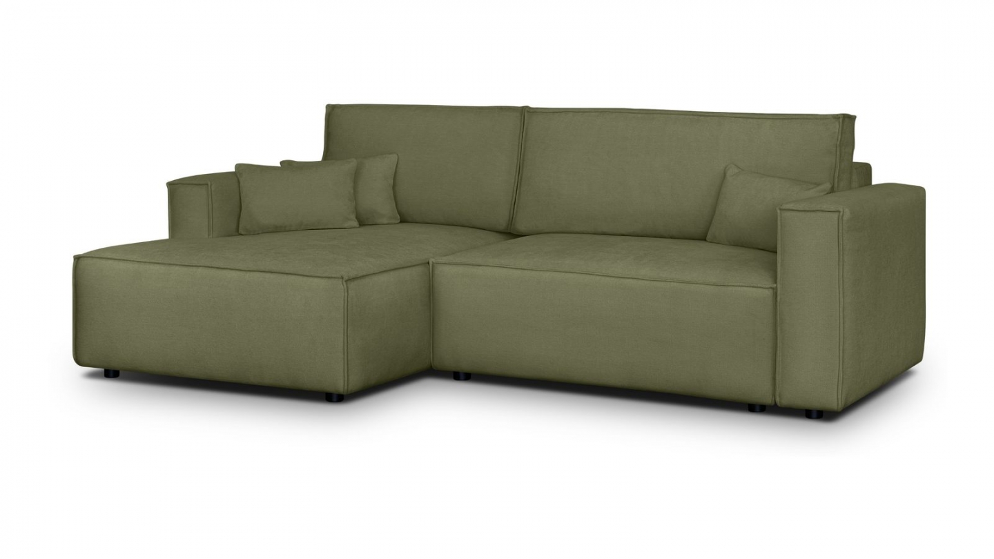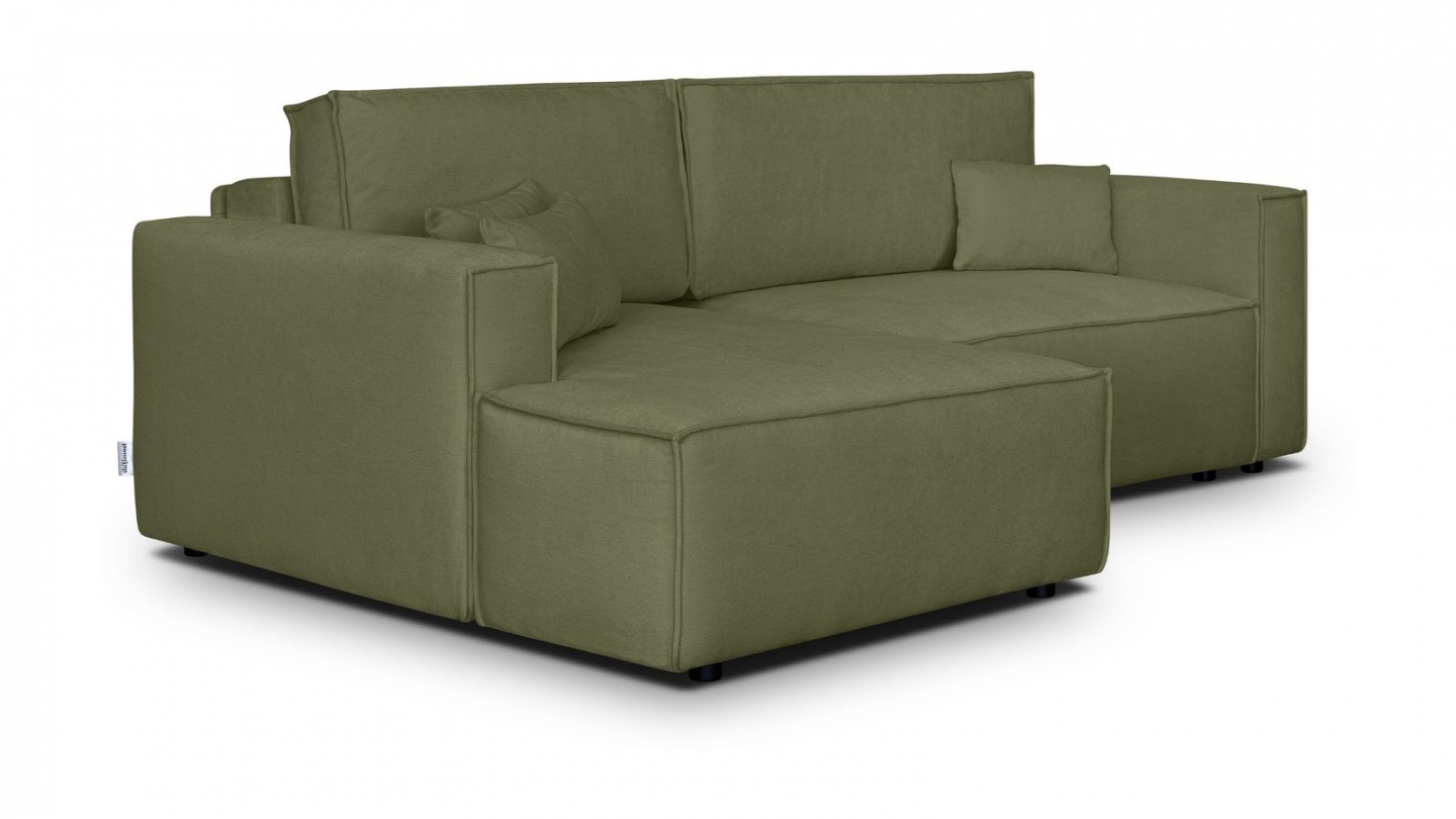 Le canapé d’angle Asti en vert olive incarne un parfait équilibre entre esthétique douce et fonctionnalité discrète.