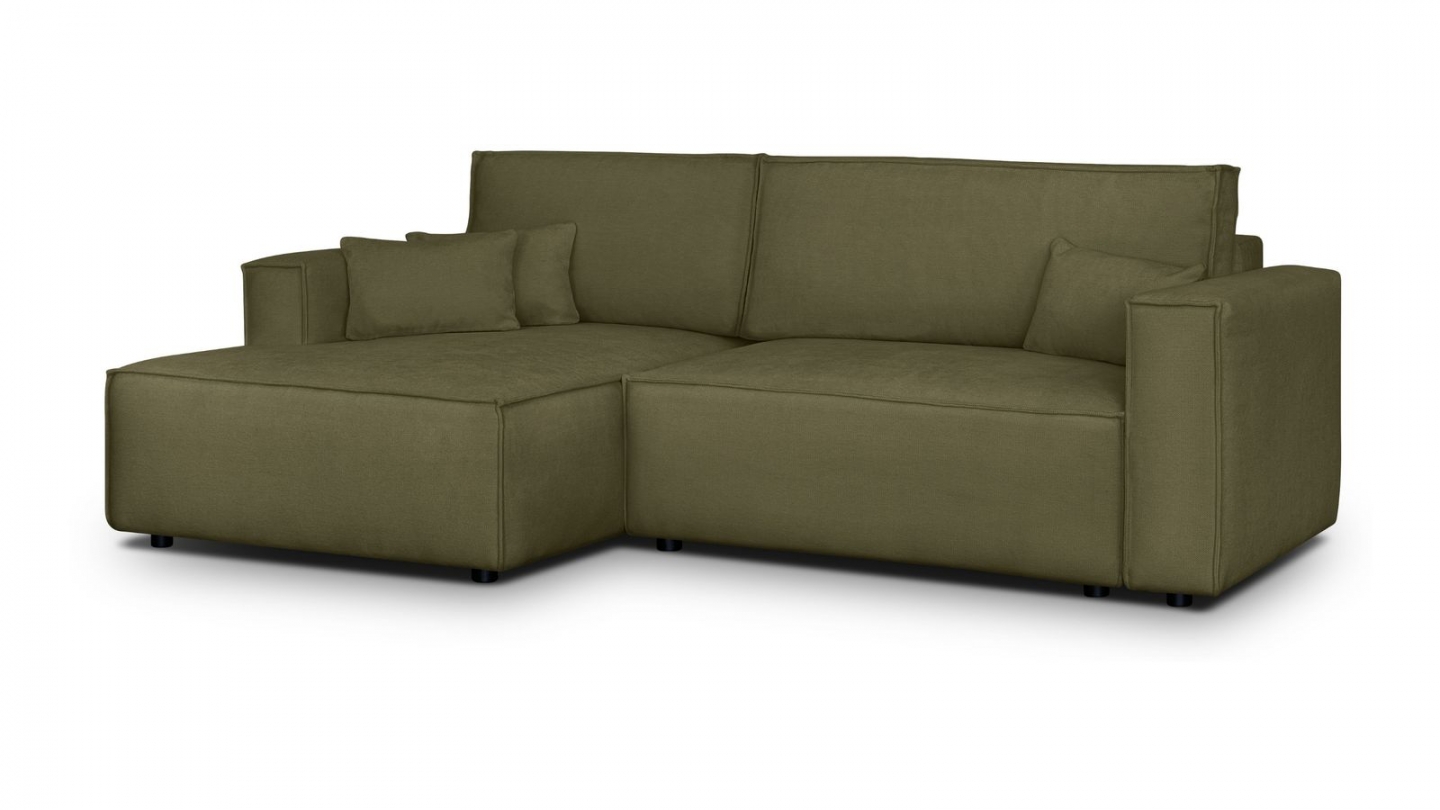 Canapé d'angle convertible 3 places en velours côtelé vert kaki• Confort : équilibré : accueil moelleux, soutien ferme• Couleur : vert kaki• Revêtement : velours côtelé certifié Oekotex - Petfriendly• Angle à gauche (lorsqu'on est face au canapé)• Coffre de rangement sous l'assise, pratique pour ranger plaids, couettes etc.• Structure en bois massif...