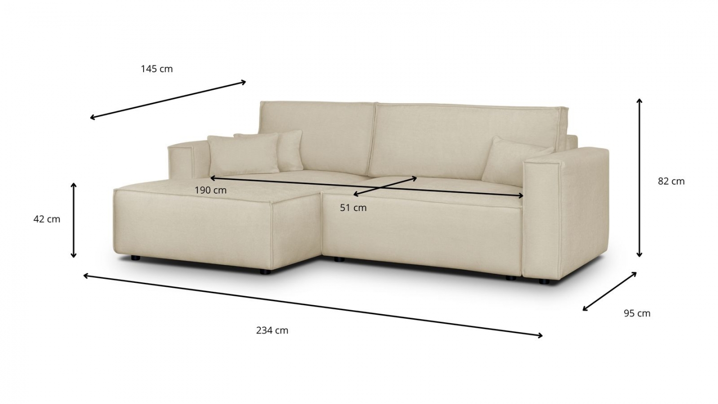 Canapé d'angle convertible 3 places - Asti• Type d'angle : à gauche (lorsqu'on se tient face au canapé)• Couleur : Moka• Revêtement : Velours côtelé 100% polyester 380 g/m² certifié Oekotex• Structure : Pin massif certifié• Garnissage : Mousse de polyuréthane 30kg/m3• Confort : équilibré (accueil moelleux, soutien ferme)• 3 coussins déco inclus• 1 coffre...