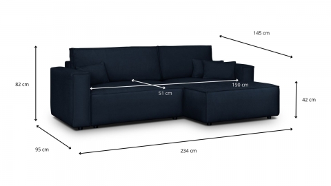 Canapé d'angle à droite convertible 3 places en tissu chenille bleu foncé est un canapé pensé pour le confort quotidien et l'élégance du salon. Son revêtement en tissu chenille offre une texture agréable au toucher et une résistance appréciable dans le temps. La teinte bleu foncé s'intègre avec naturel dans de nombreuses ambiances déco, du style scandinave au décor contemporain. Une fois déplié, il offre un couchage de 137, parfait pour accueillir vos invités dans le confort. Son coffre de rangement intégré permet de ranger plaids et linge de lit discrètement sous l'assise. L'angle structure naturellement l'espace et délimite une zone salon confortable et conviviale. Avec des dimensions totales de 234, il s'intègre aussi bien dans les grands espaces que dans les pièces à vivre de taille intermédiaire. Fabriqué en Europe, il répond aux exigences de qualité les plus strictes.
