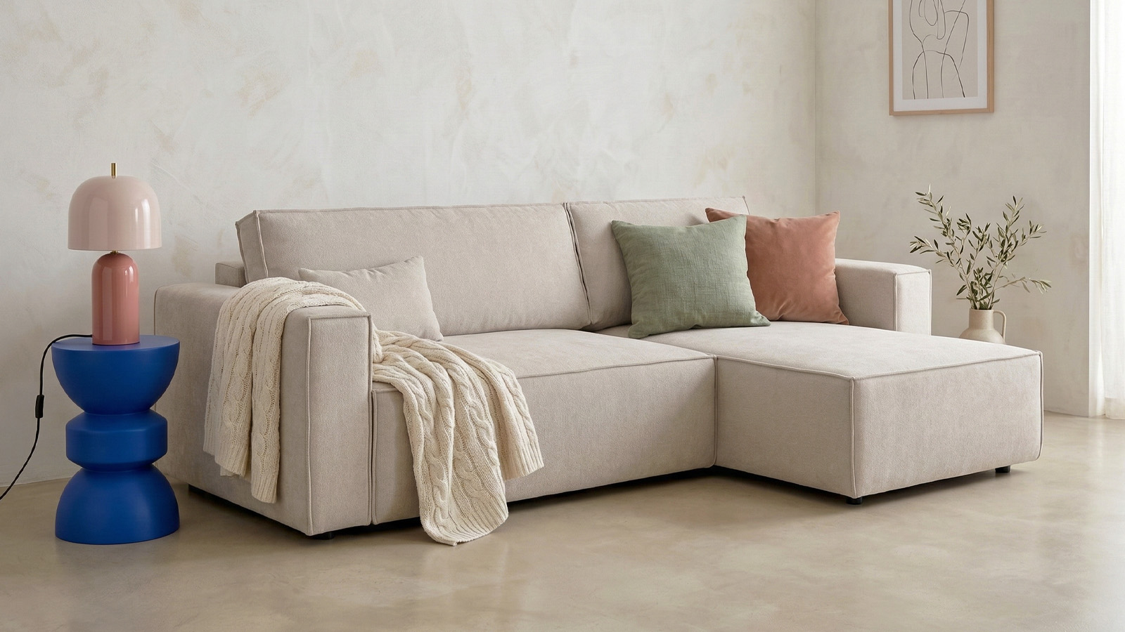 Canapé d'angle convertible 4 places en velours côtelé beige Confort : équilibré : accueil moelleux, soutien ferme Couleur : beige Revêtement : velours côtelé - certifié Oekotex - Petfriendly Angle réversible : adaptez la configuration de votre canapé avec un angle à droite ou à gauche en fonction de vos envies ! Coffre de rangement sous l'assise,...