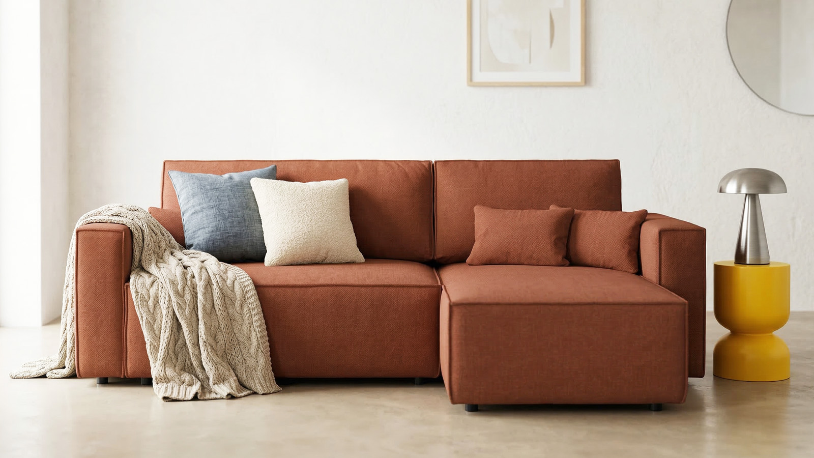• Canapé d'angle convertible 4 places en tissu chenille rouille foncé