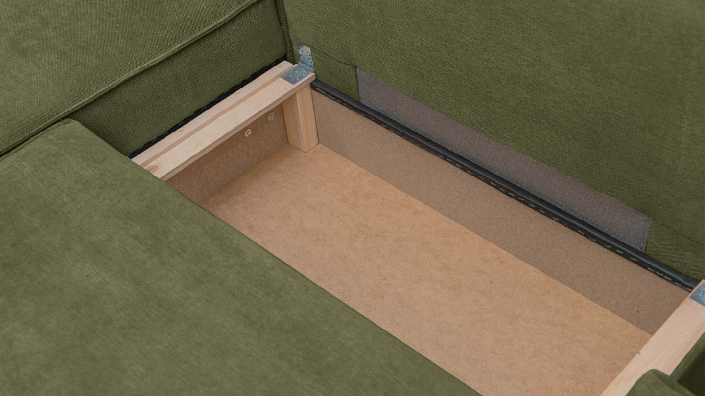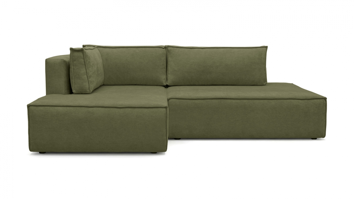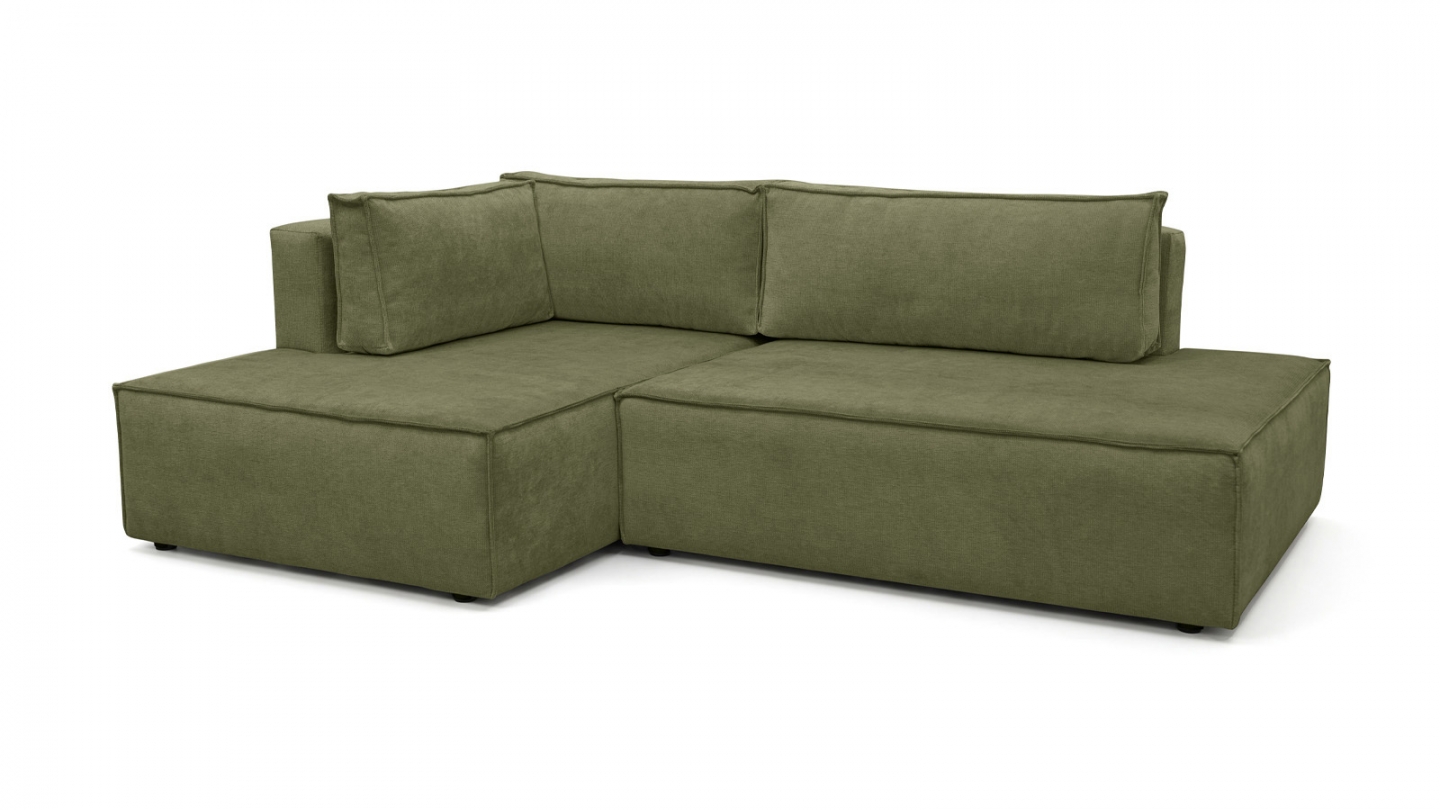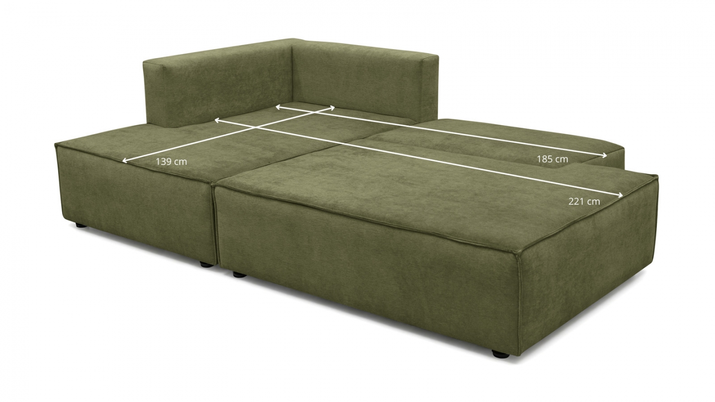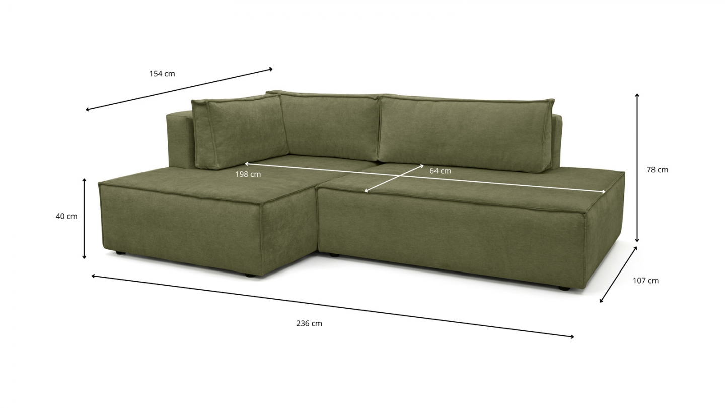 Canapé d'angle à gauche (lorsqu'on est face au canapé) : glissez l'assise et rabattez le dossier — converti en lit en quelques secondes. Couchage occasionnel pour 2 personnes.