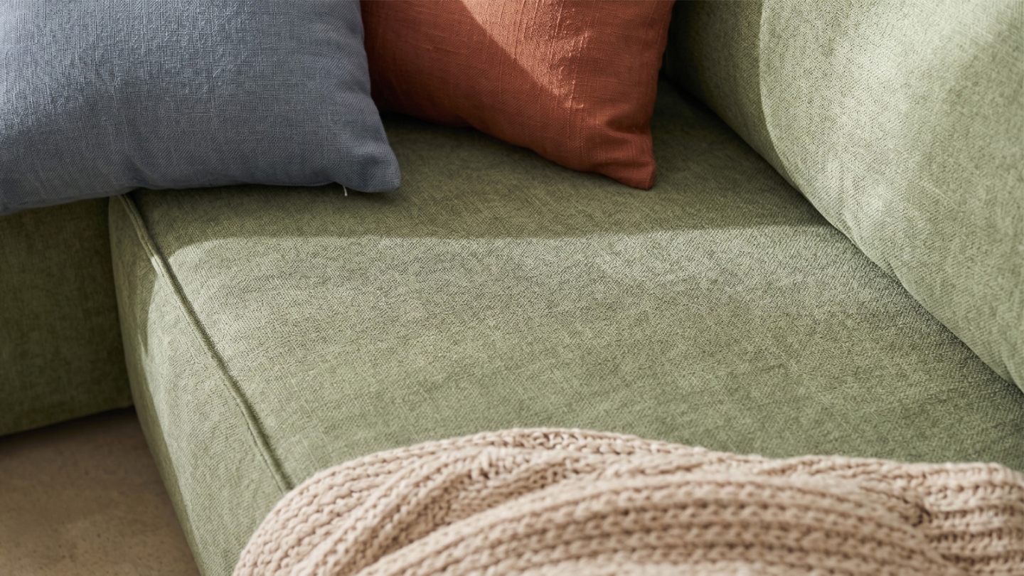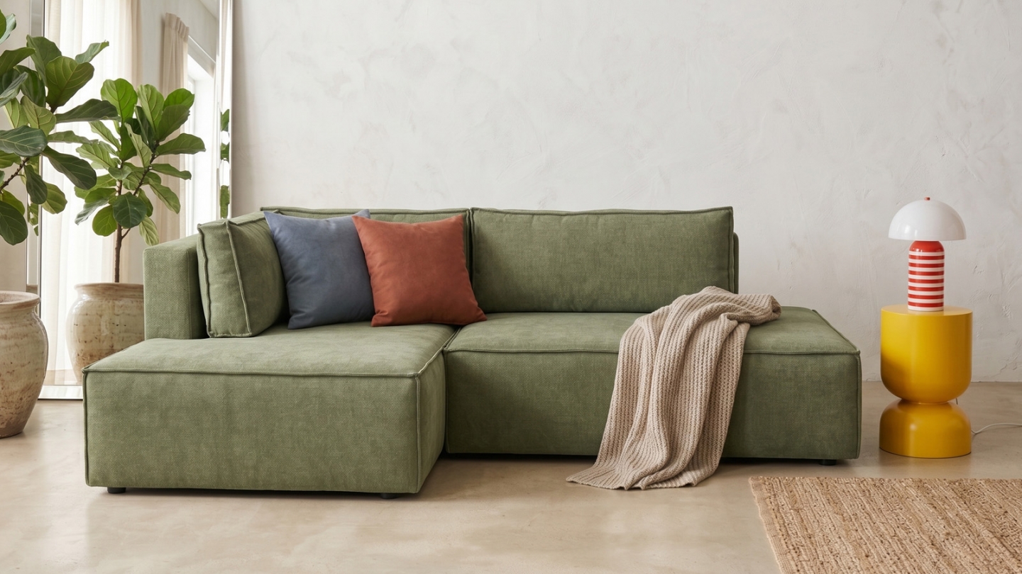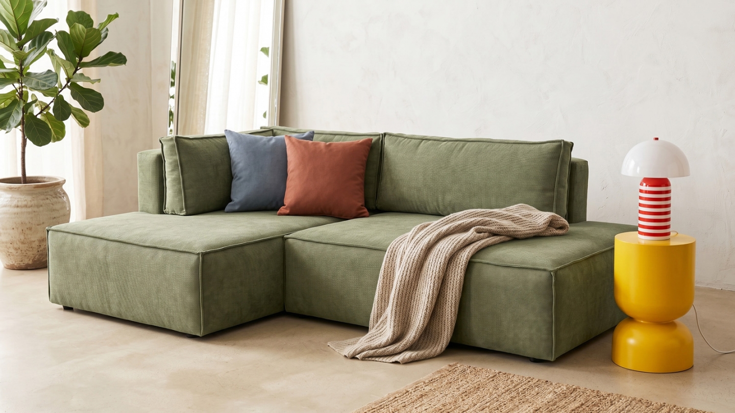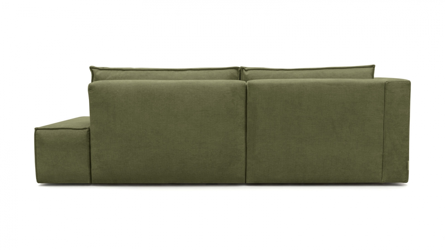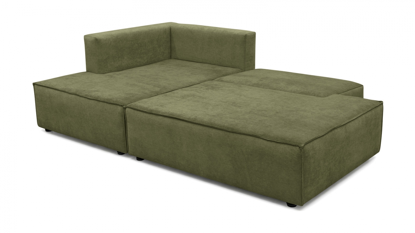 Canapé d'angle à gauche (lorsqu'on est face au canapé) : glissez l'assise et rabattez le dossier — converti en lit en quelques secondes. Couchage occasionnel pour 2 personnes.