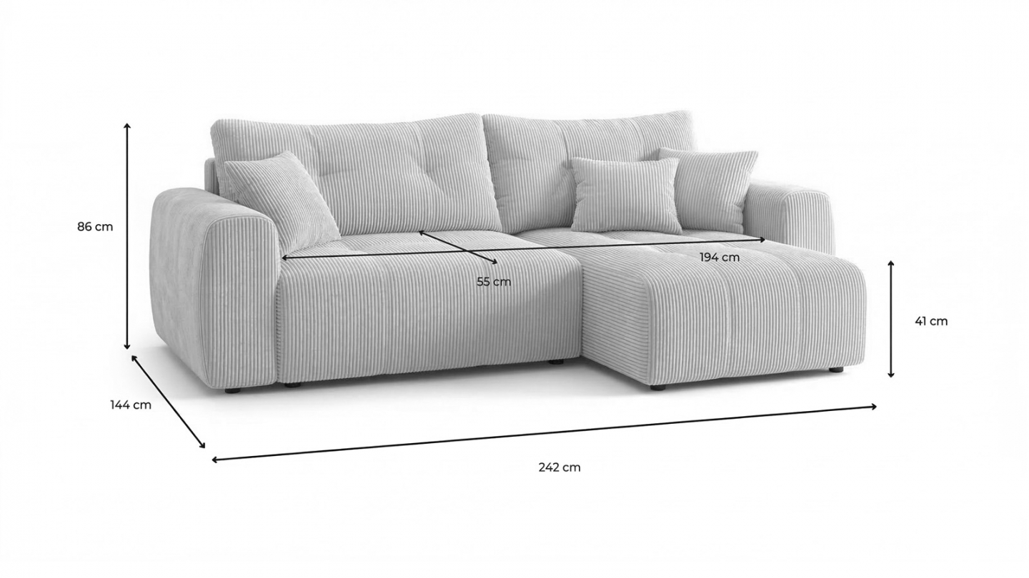 Doté d’une structure en bois robuste, Alba assure une bonne stabilité et une durabilité appréciable. Ses dimensions généreuses de 242 x 144 x 86 cm en font une pièce centrale du salon, capable de s’adapter à différentes configurations grâce à son angle réversible. Fabriqué en Europe, le canapé d’angle convertible Alba répond aux exigences de confort et de praticité, tout en conservant une esthétique soignée et actuelle.