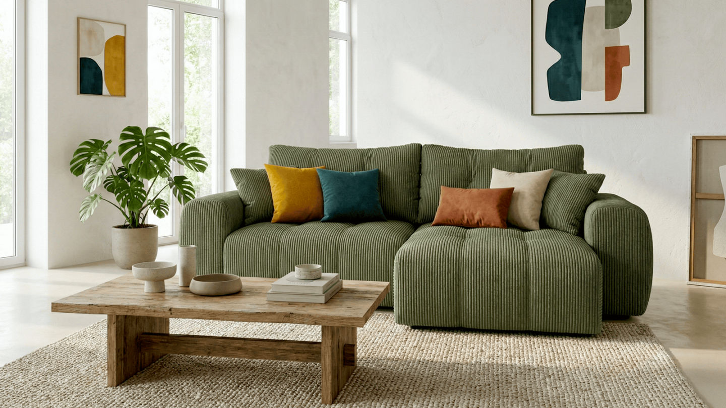 En stockCanapé d'angle convertible 4 places - Alba• Type d'angle : réversible. Adaptez la configuration de votre canapé avec un angle à droite ou à gauche en fonction de vos envies.• Couleur : Vert olive• Revêtement : Tissu chenille 230 g/m² certifié Oeko-Tex®• Structure : Bois• Garnissage : Mousse de polyuréthane expansé 25 Kg/m3• Confort : équilibré (accueil...