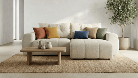 Le canapé d’angle convertible Alba allie confort généreux, fonctionnalité et lignes équilibrées pour s’intégrer naturellement dans le salon. Son revêtement en tissu chenille beige 230 g/m², certifié Oeko-Tex®, apporte une texture douce et chaleureuse, idéale pour créer une atmosphère cosy et apaisante. Cette teinte neutre et lumineuse s’intègre facilement dans différents styles d’intérieur, du contemporain au plus classique.
