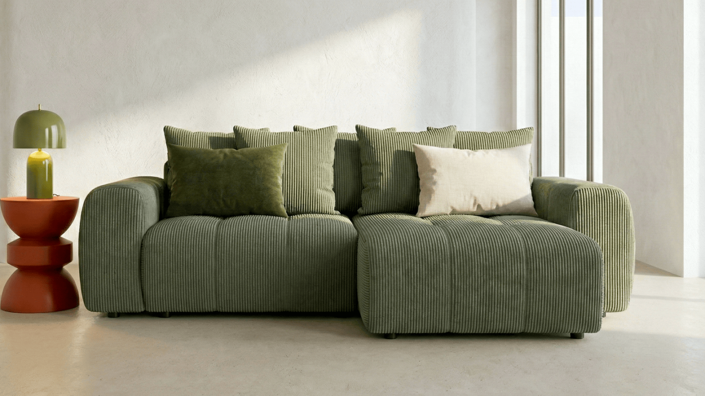 Canapé d'angle convertible 4 places - Rivoli• Angle réversible permettant d’installer le canapé à droite ou à gauche selon l’agencement de votre pièce.• Couleur : Vert olive• Revêtement : Tissu chenille 230 g/m² certifié Oeko-Tex®, testé pour limiter la présence de substances nocives et offrir un contact plus sûr au quotidien• Structure : Bois• Garnissage...