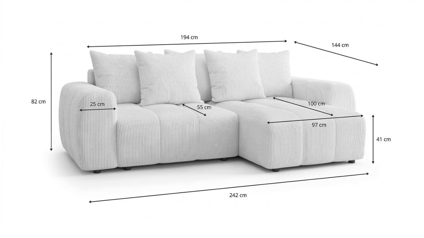 Le couchage intégré de 128 x 192 cm constitue une solution pratique pour recevoir ponctuellement, tandis que le coffre de rangement sous l’assise permet d’optimiser l’espace du salon. Avec ses dimensions de 242 x 144 x 82 cm et sa méridienne spacieuse (97 x 100 cm), il accueille confortablement jusqu’à 4 personnes. Fabriqué en Europe, il allie solidité, fonctionnalité et durabilité.