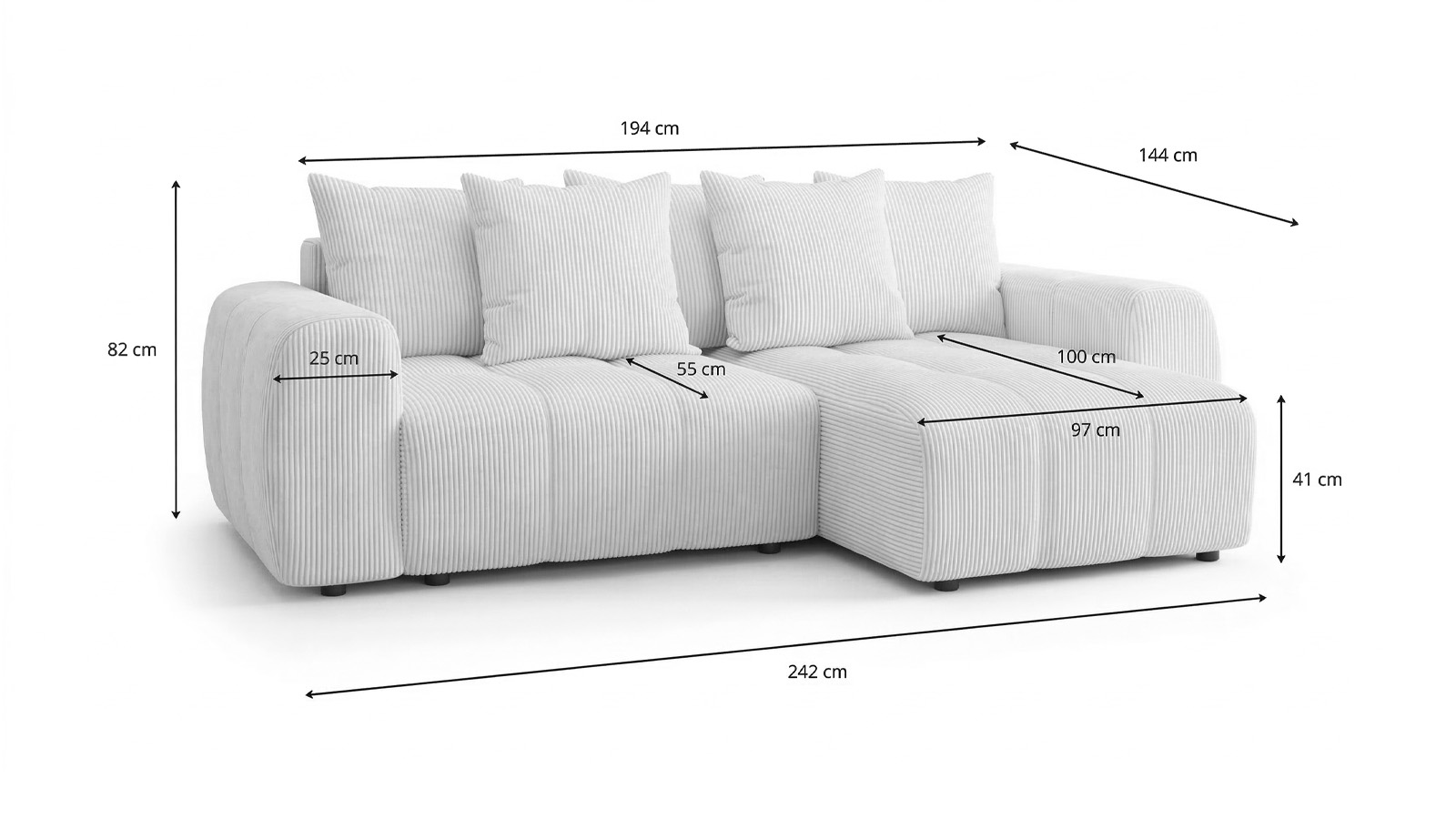 • Largeur d'assise : 194 cm - Profondeur d'assise : 55 cm - Hauteur d'assise : 41 cm